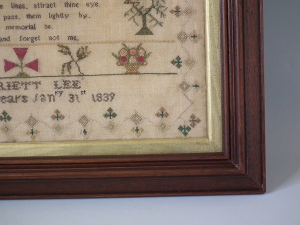 Victorian, dated 1839. 16ins by 12ins wide. 1839 Sampler by Harriet Lee. Framed in an old wood frame with gilt slip and glass.
