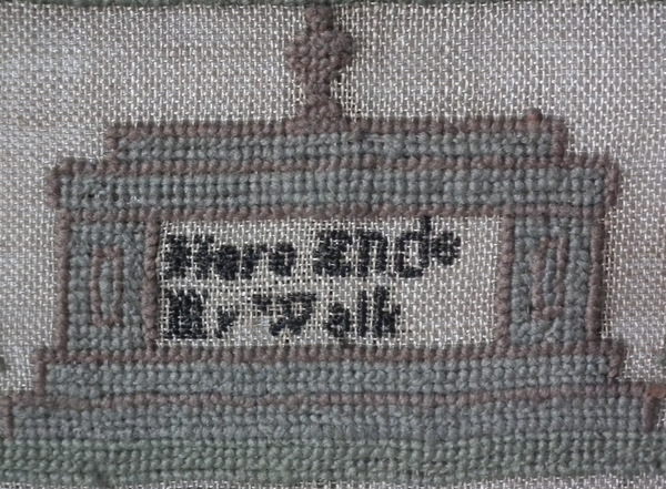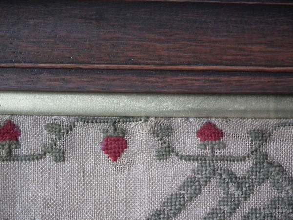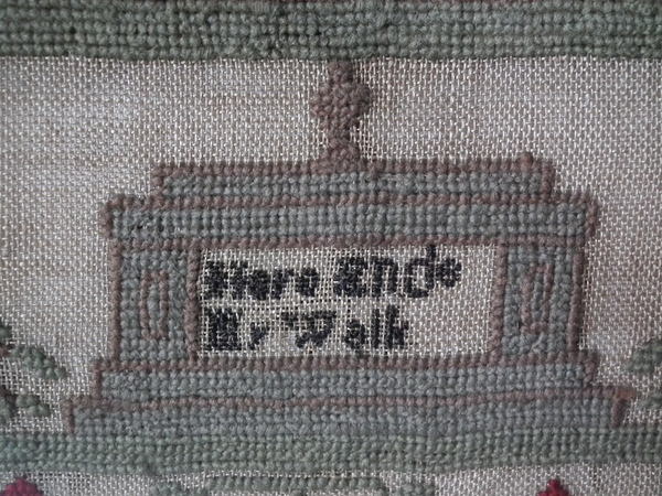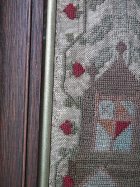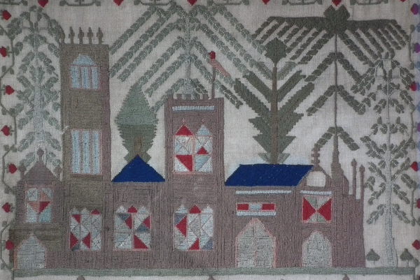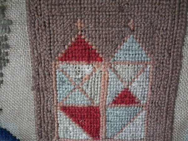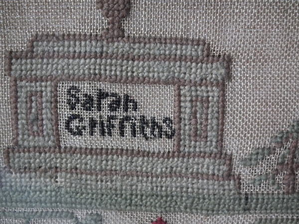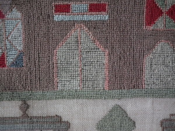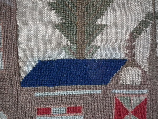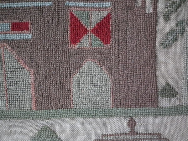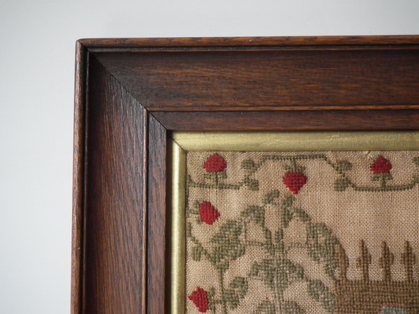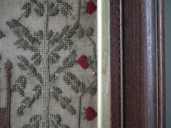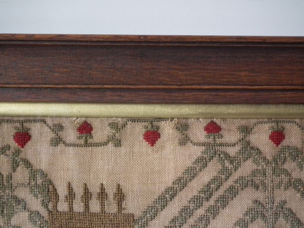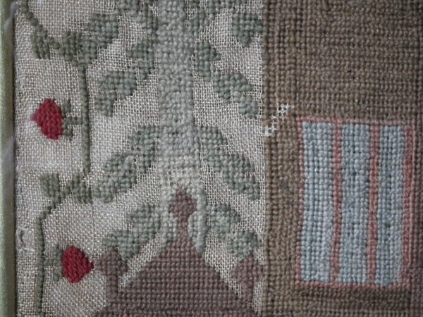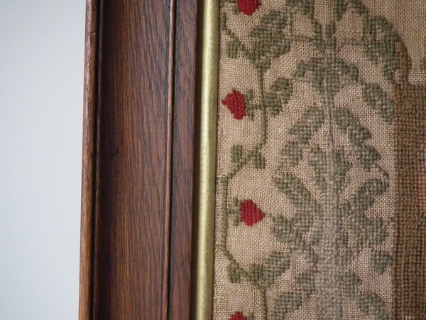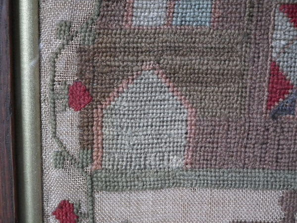 The sampler is worked in fine wool on canvas ground, in cross stitch throughout.