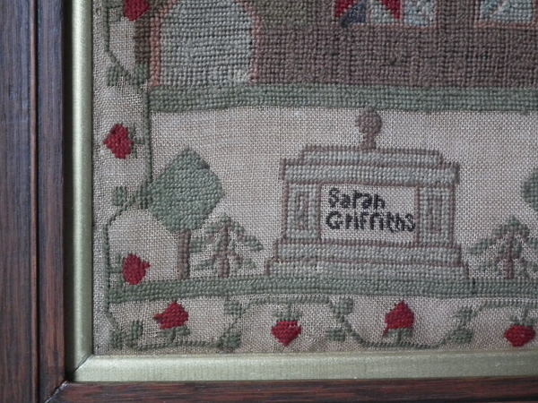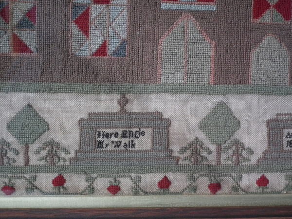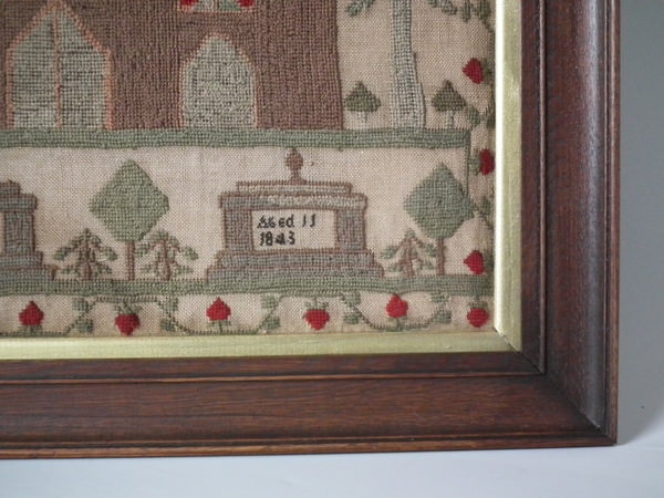 Victorian, dated 1843. 20.5ins by 17.25ins. 1843 Church Sampler by Sarah Griffiths. Framed in an old wood frame with gilt slip and glass.