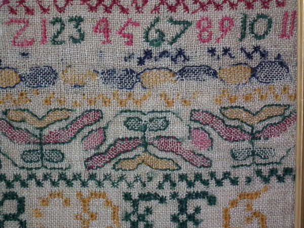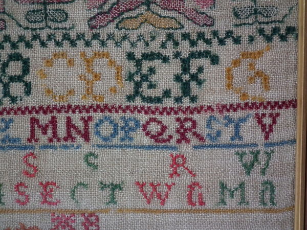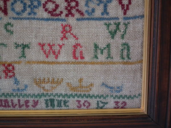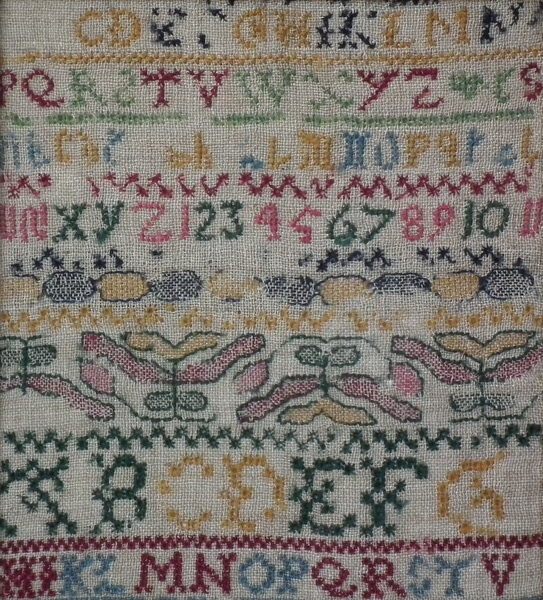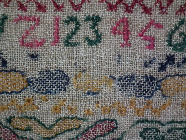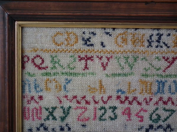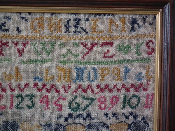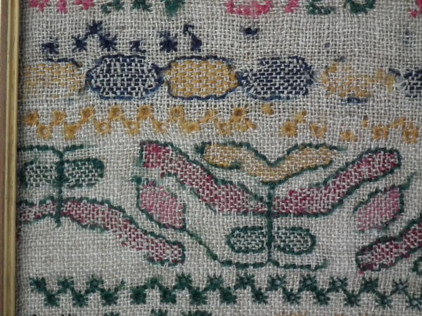 The sampler is worked in wool on canvas ground, in cross stitch throughout.