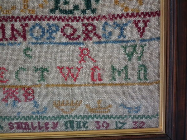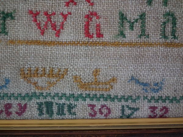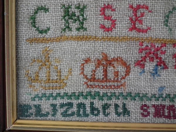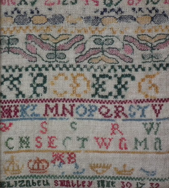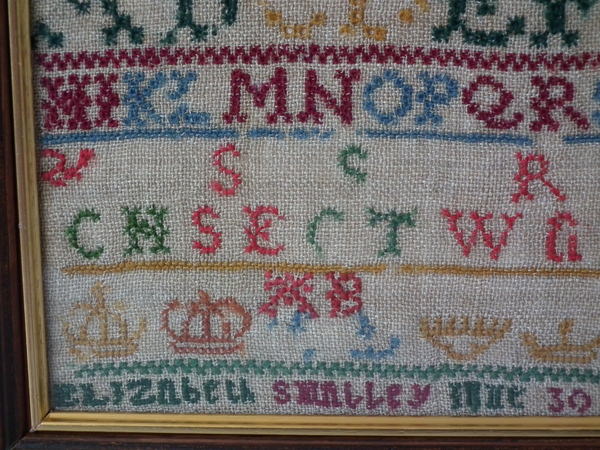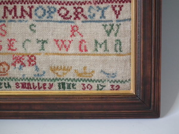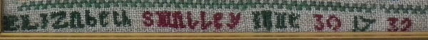 George II, dated 1732. 10.75ins by 7.25ins. 1732 Sampler by Elizabeth Smalley. Framed in an old wood frame with gilt slip and glass.