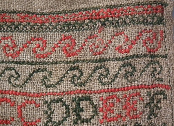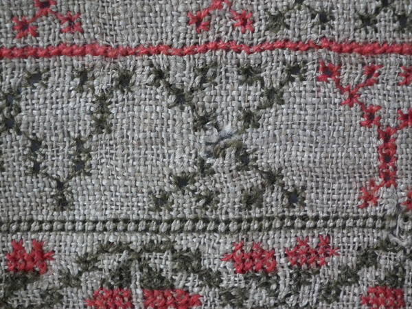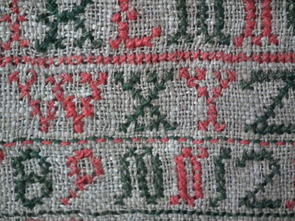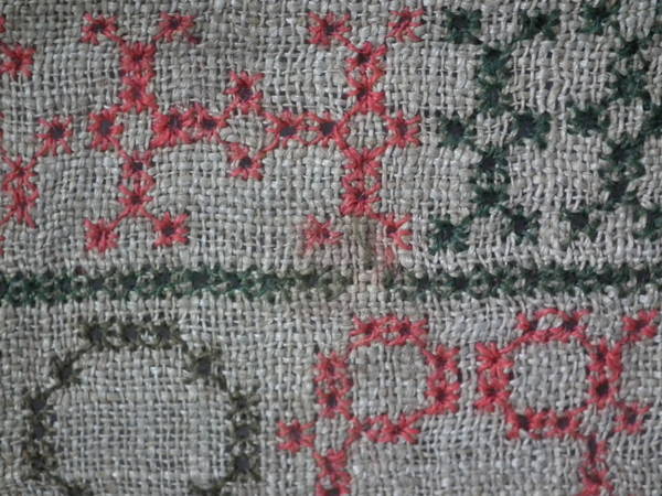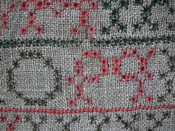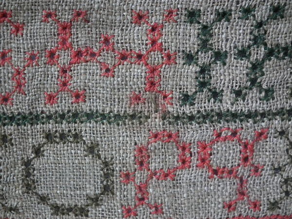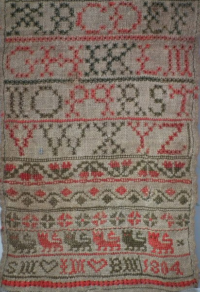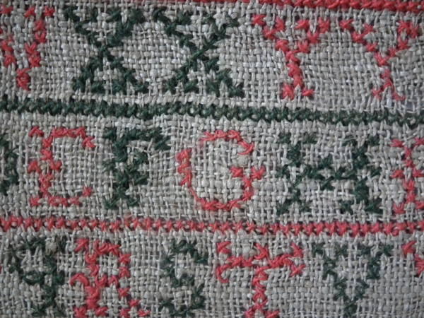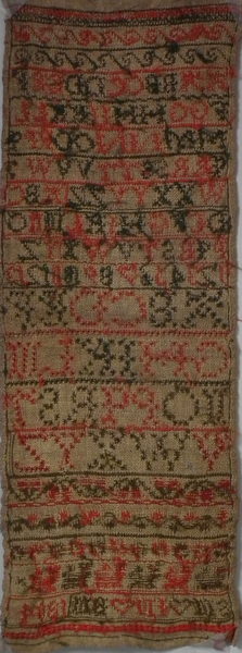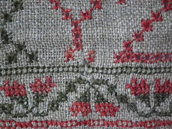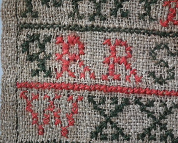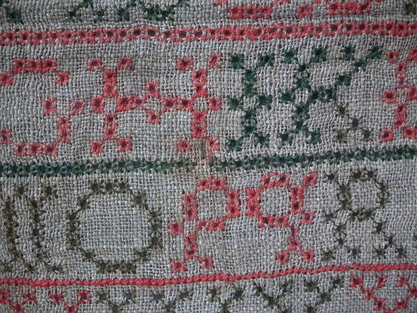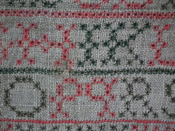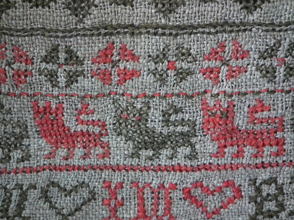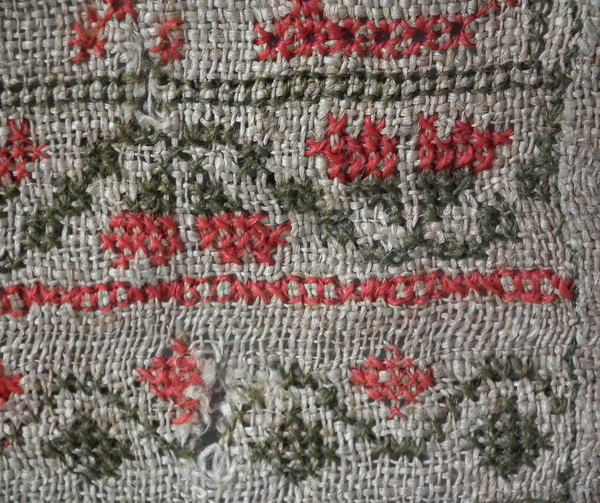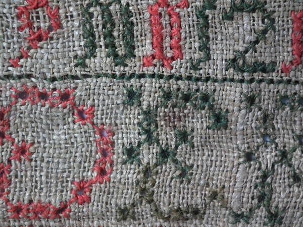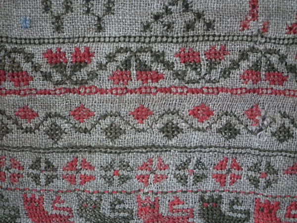 The sampler is worked in fine wool on canvas ground, in cross stitch throughout.