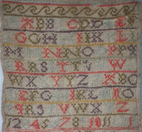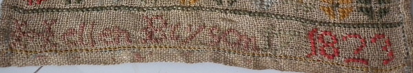 George IV, dated 1823. 16.5ins by 8ins wide. 1823 Alphabet Sampler by Hellen Bryson.