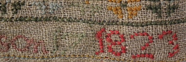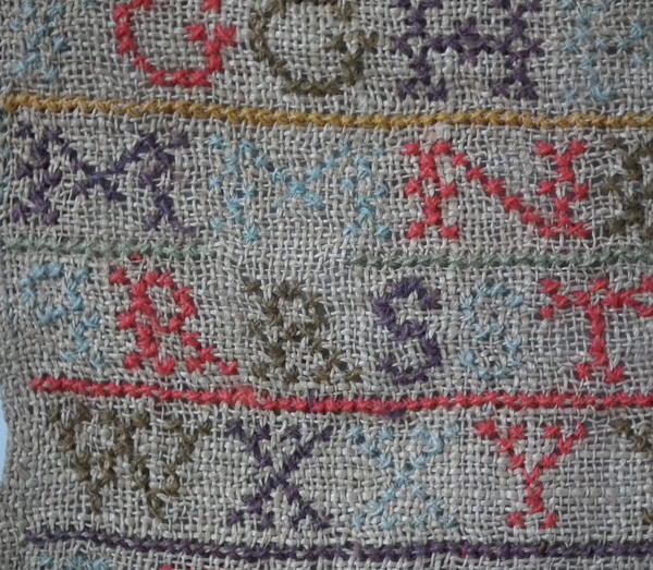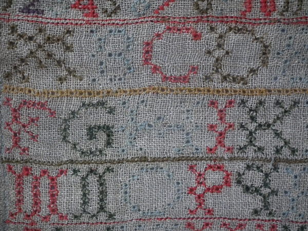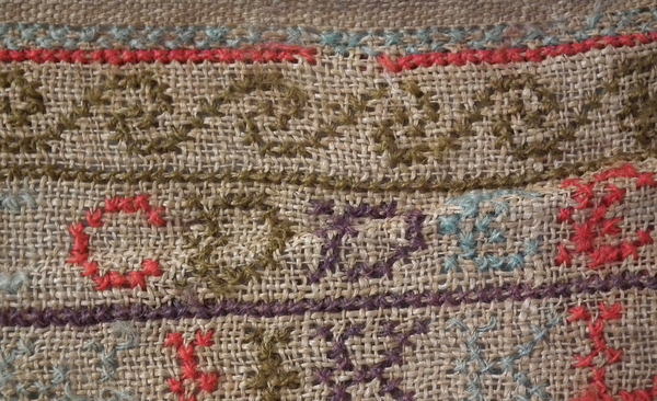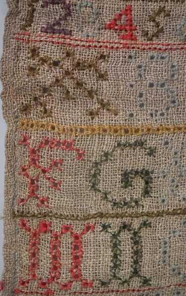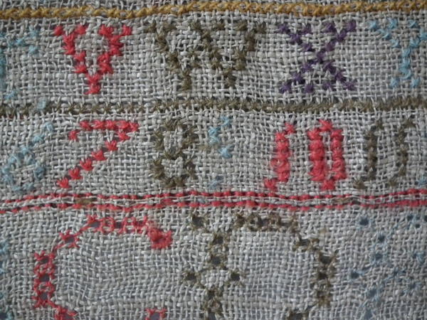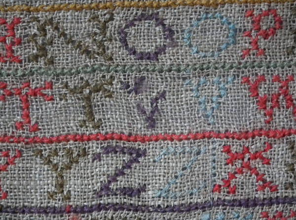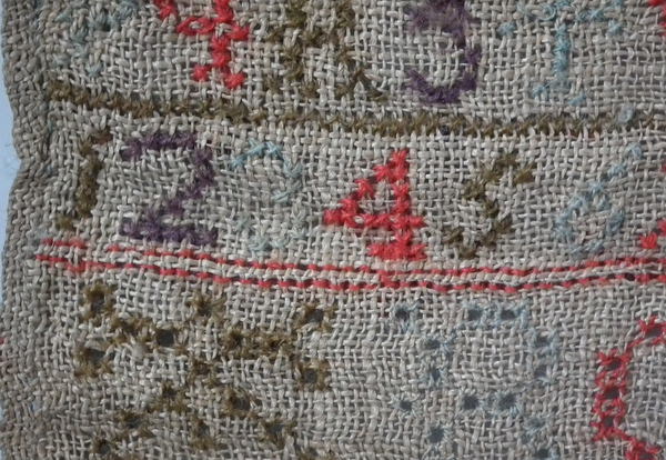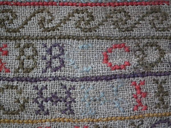 Unframed. The sampler is worked in various threads on linen ground, in a variety of stitches including Algerian eye.