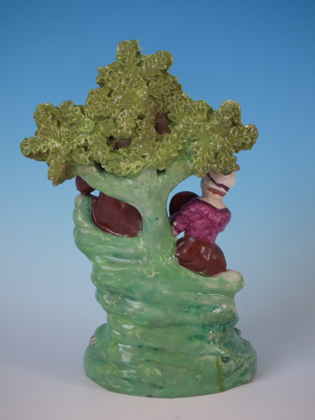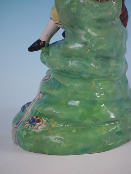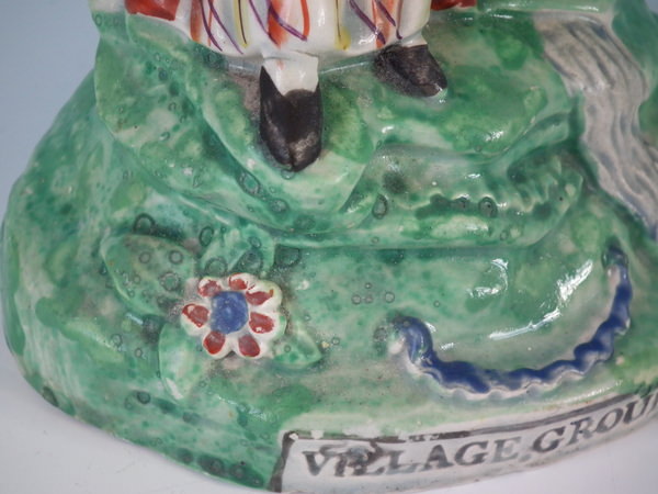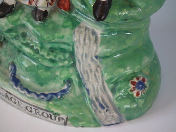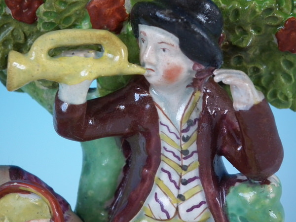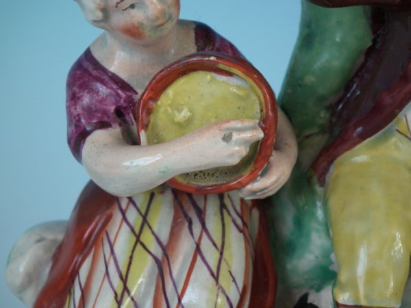 Staffordshire pearlware bocage group with a pastoral theme which features a lady and gent with musical instruments,