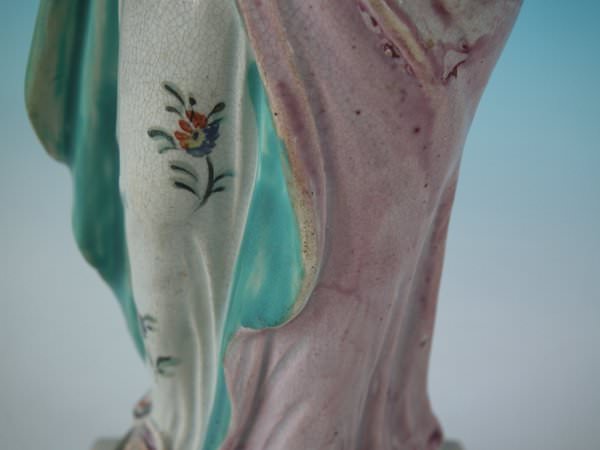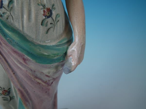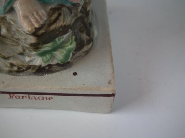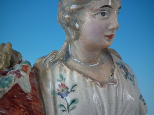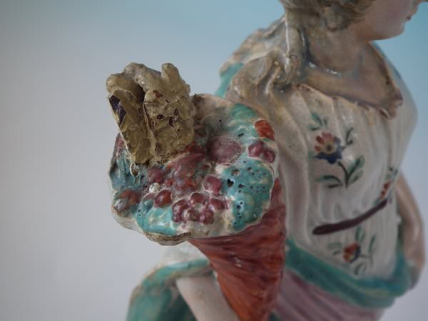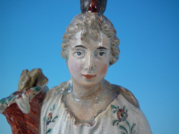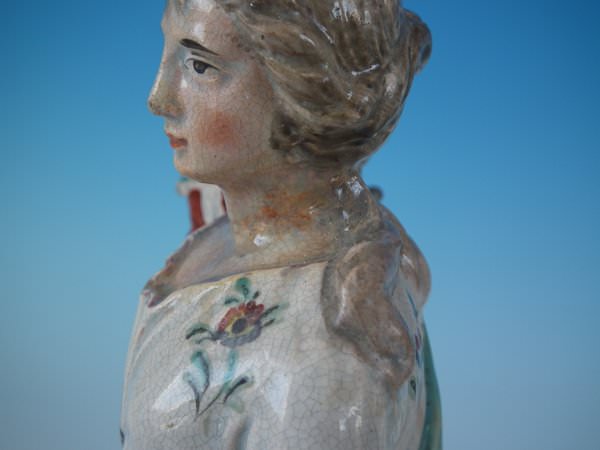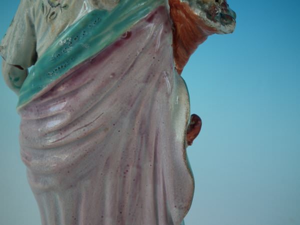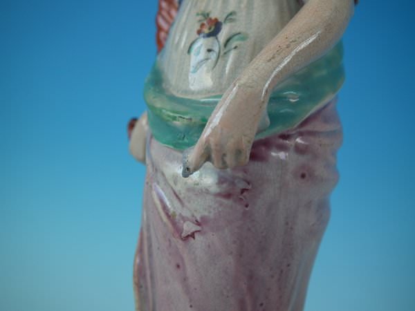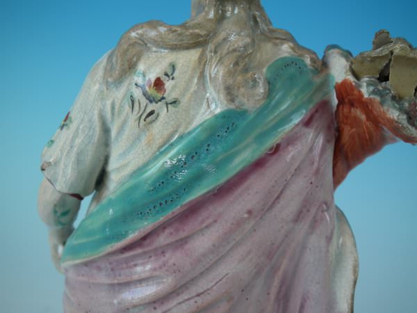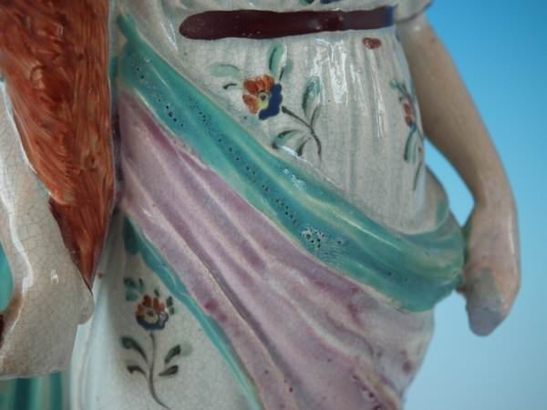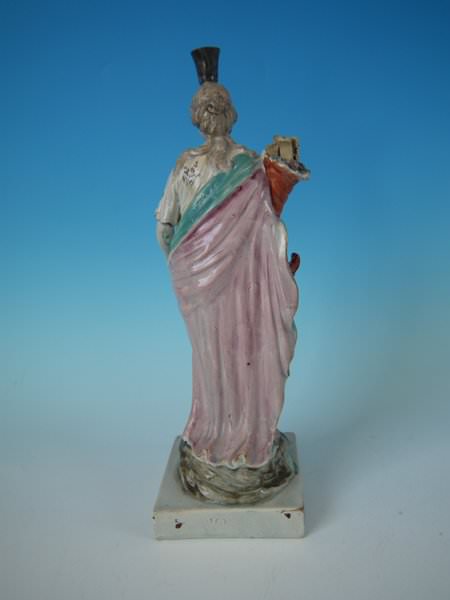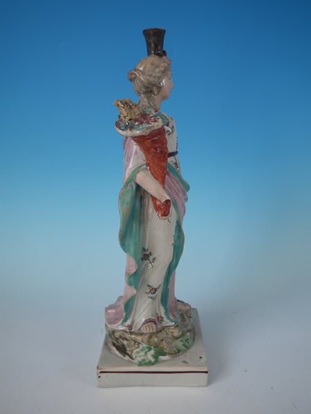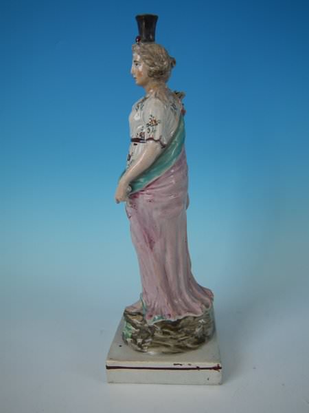 pre-Victorian, circa 1820. 10.8ins high, 3.4ins wide, 3.4ins depth. Ralph Wood Staffordshire pearlware figure with a mythological theme which features a woman holding a cornucopia of flowers, stood on a square base.