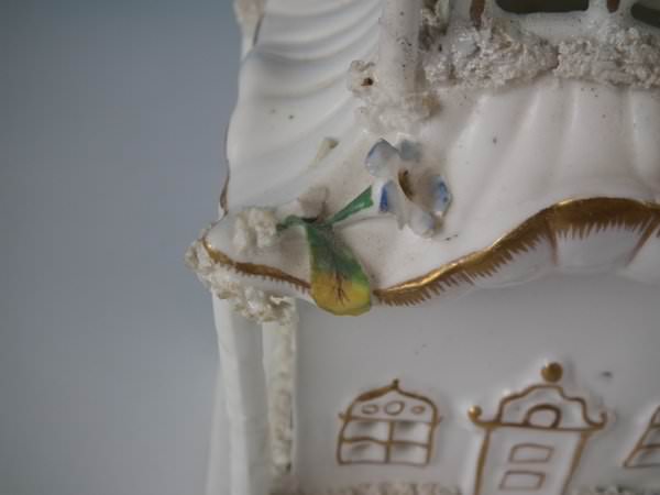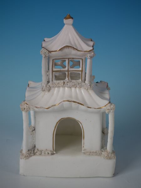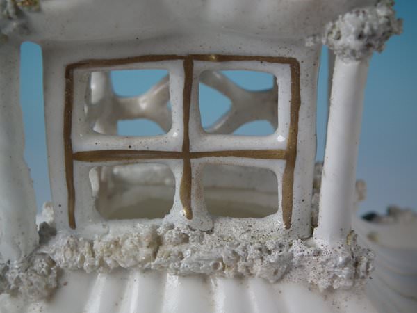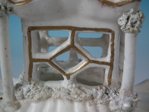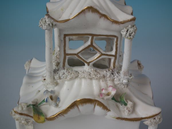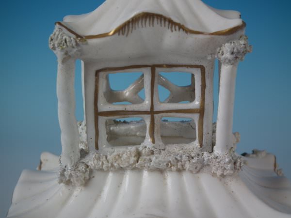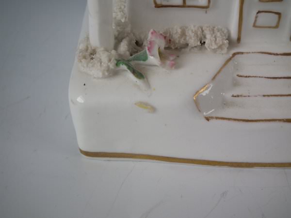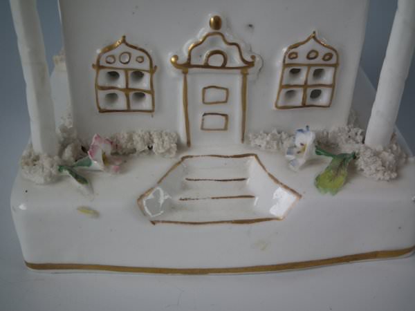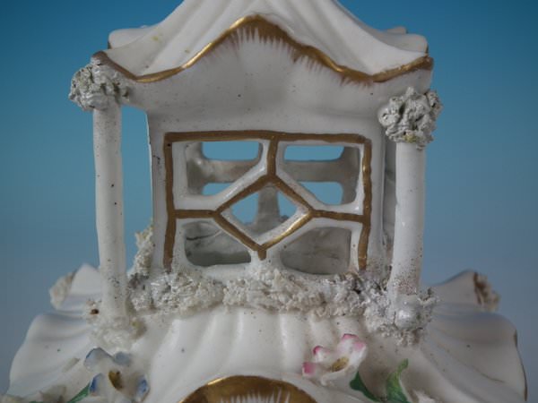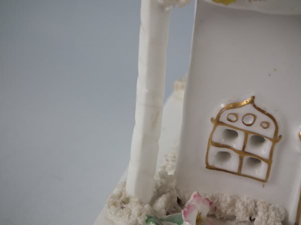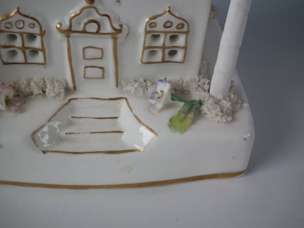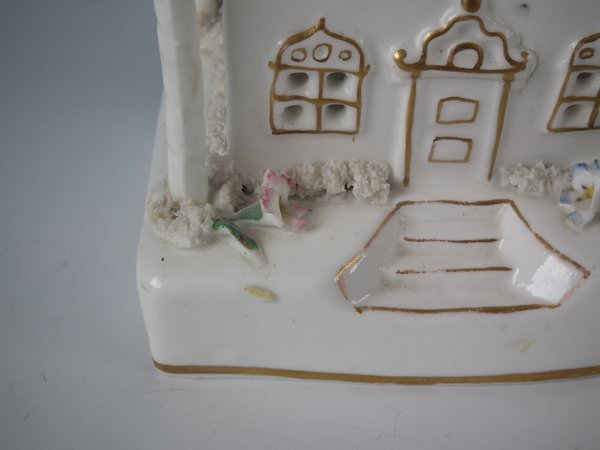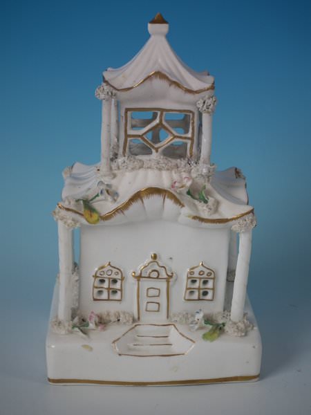 Victorian, circa 1850. 7.7ins high, 4.7ins wide, 4.3ins depth. Staffordshire porcellaneous pastille burner which features a twin storey cottage, stood on a rectangular base.