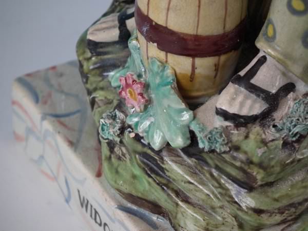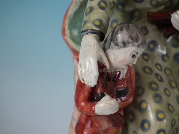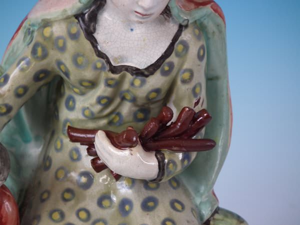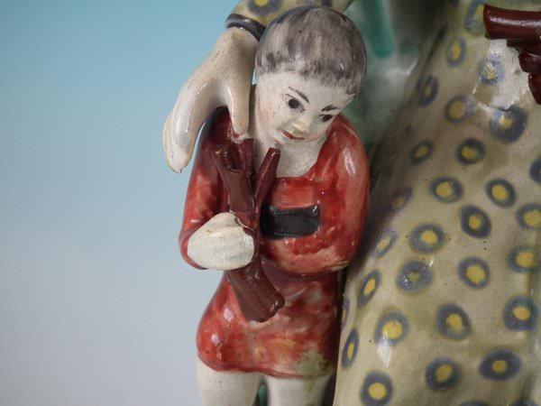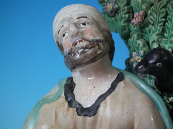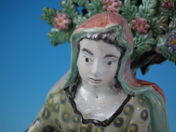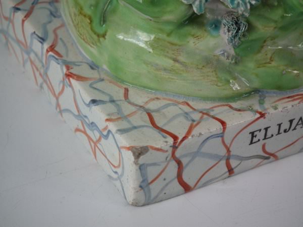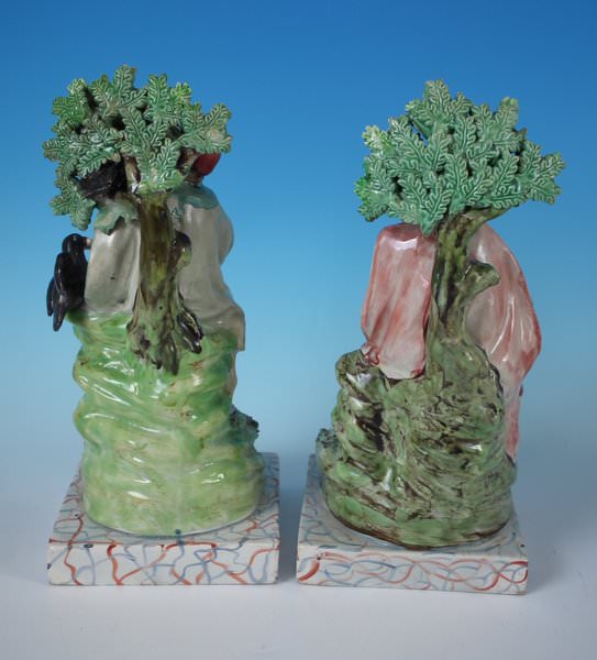 Pair of Staffordshire pearlware bocage figures with a religious theme which feature Elijah feeding two ravens and the Widow holding a stick with her son by her side, seated on a square base.