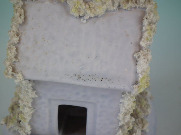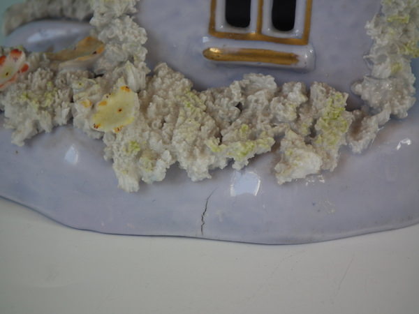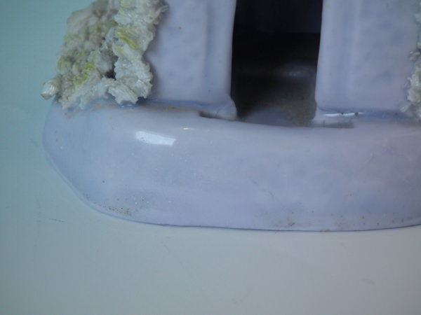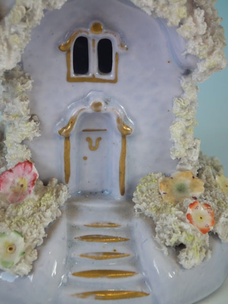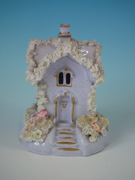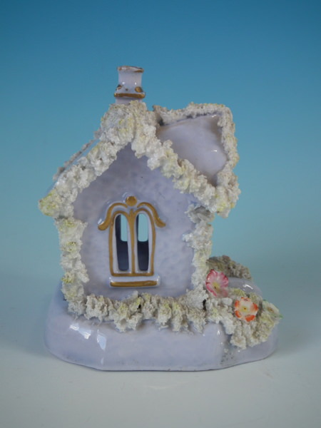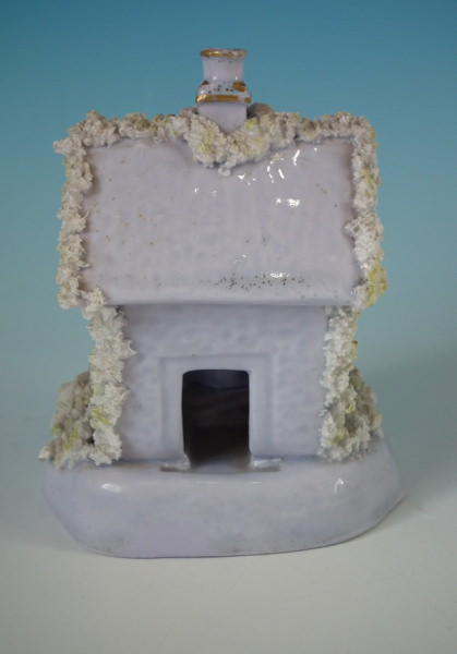 Staffordshire pastille burner which features a lilac cottage, sat on a shaped base.