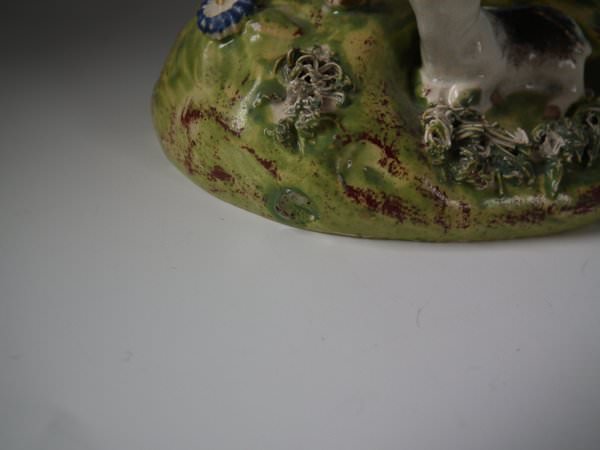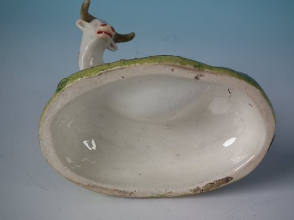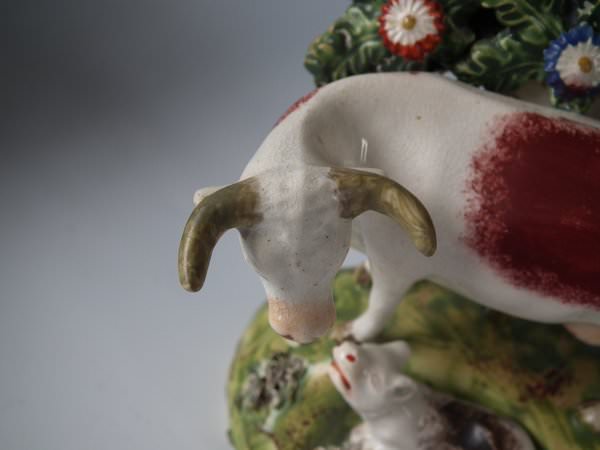 Victorian, circa 1820. 5.5ins high, 3.9ins wide, 3ins depth. Walton Staffordshire pearlware bocage figure which features a cow and it's calf, stood on an oval base.
