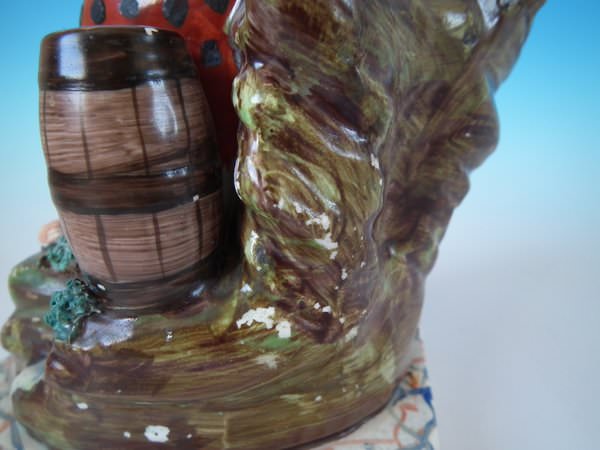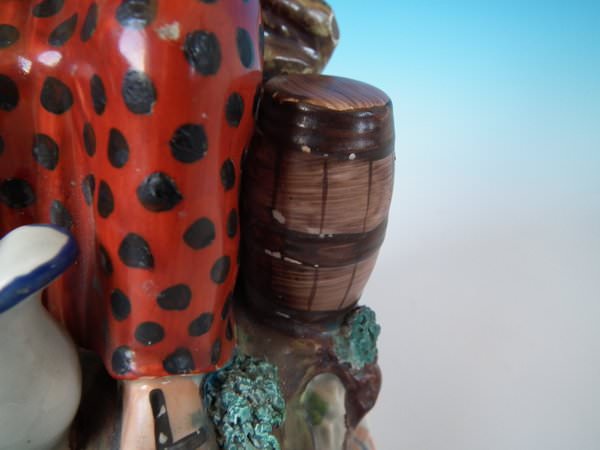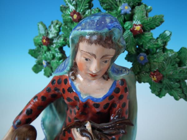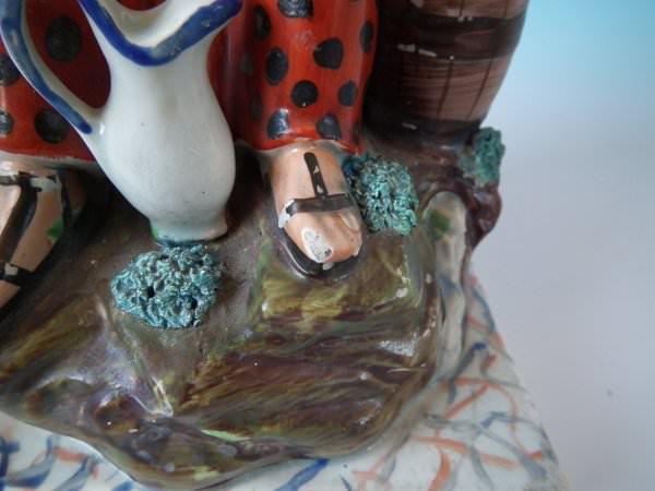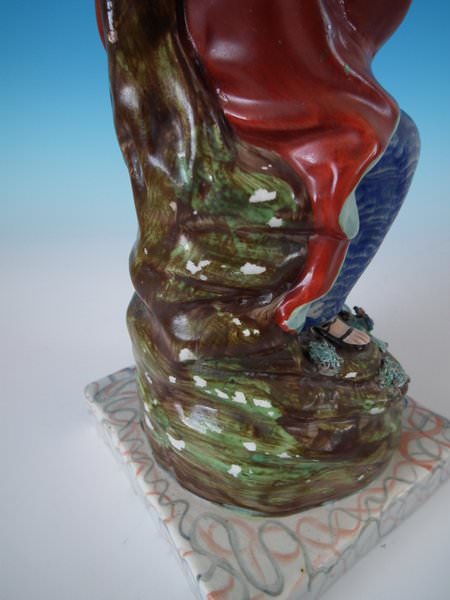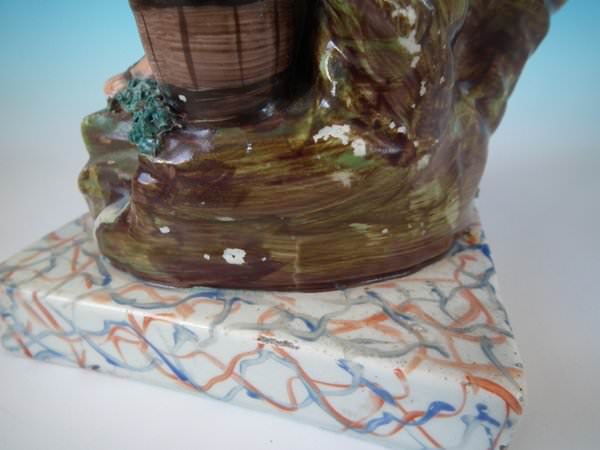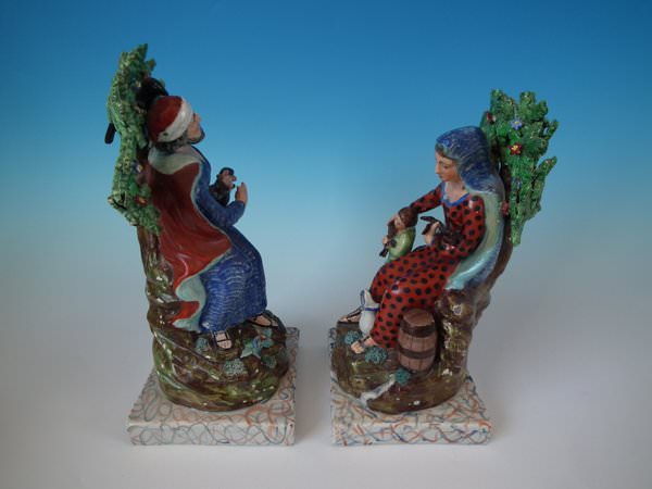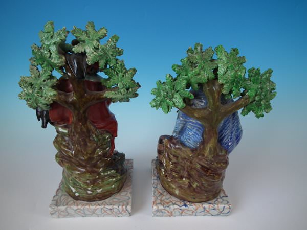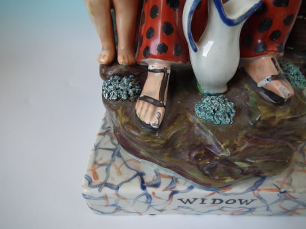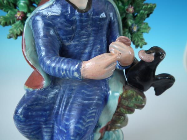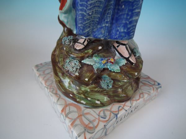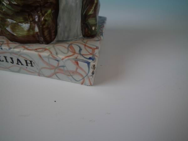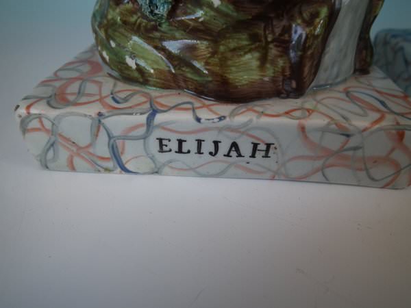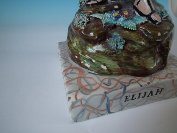 pre-Victorian, circa 1820. Tallest is 11.2ins high, 5.9ins wide, 4.9ins depth. Pair of Staffordshire pearlware bocage figures with a religious theme which feature Elijah feeding two ravens and the Widow holding sticks with her son by her side, seated on a marbleised base.