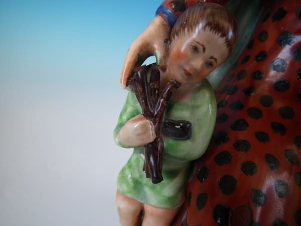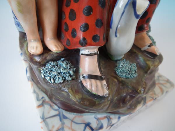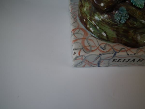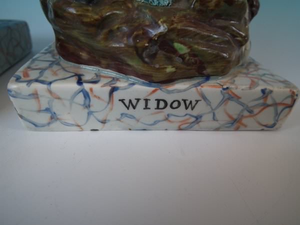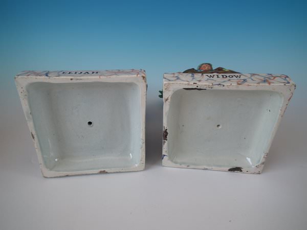 The pieces are titled, 'ELIJAH' and, 'WIDOW' to the fronts. Decorated 'in the round' - decoration to front and reverse. Vent hole to the underside.
