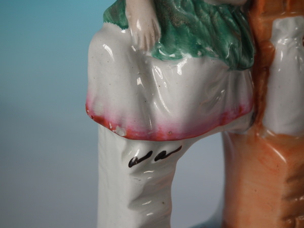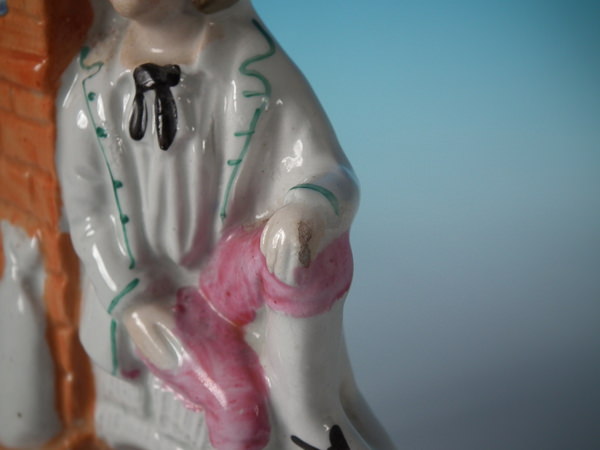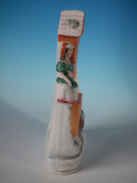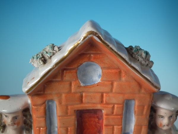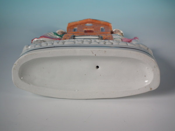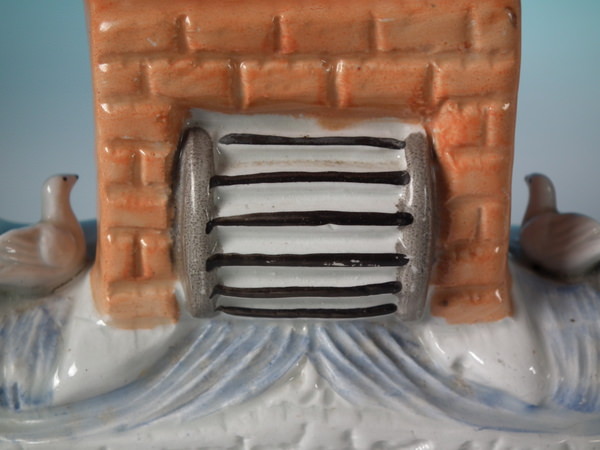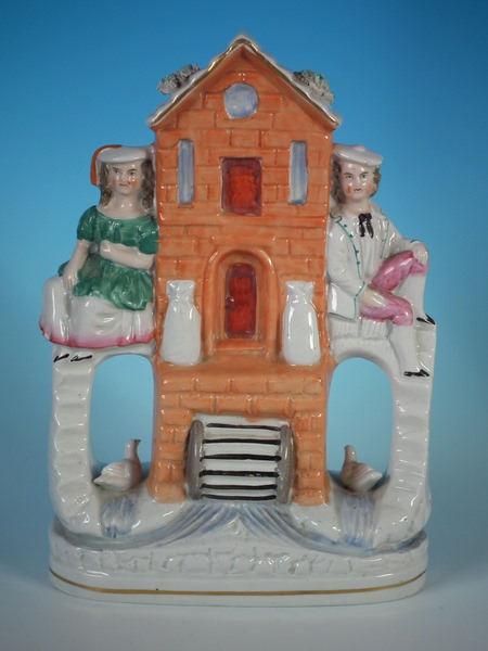 Victorian, circa 1860. 8.7ins high, 6.1ins wide, 2.4ins depth. Staffordshire group which features a water mill with a girl and boy seated on a bridge, resting on a rectangular base.