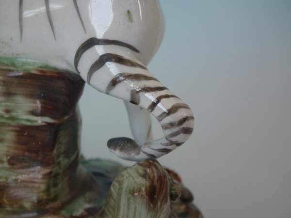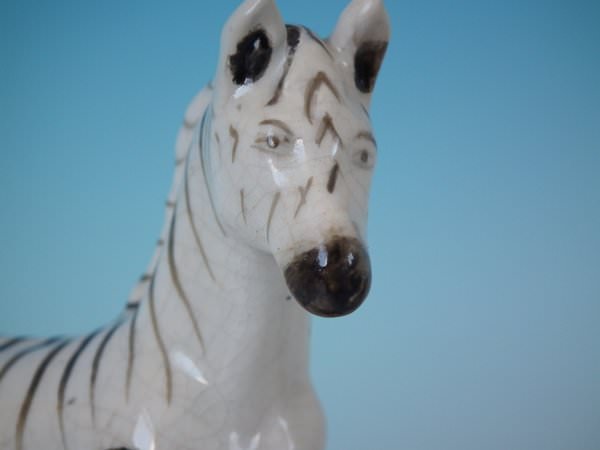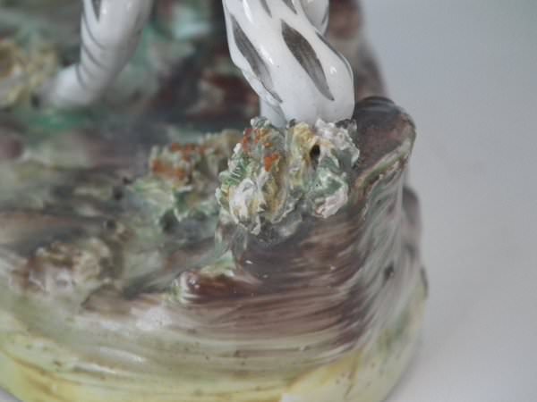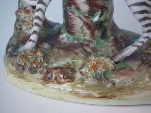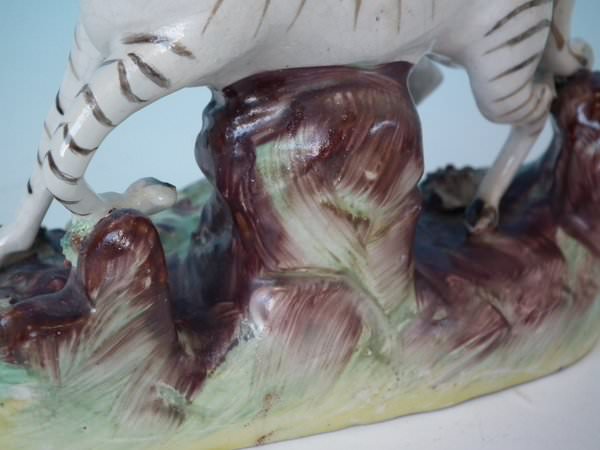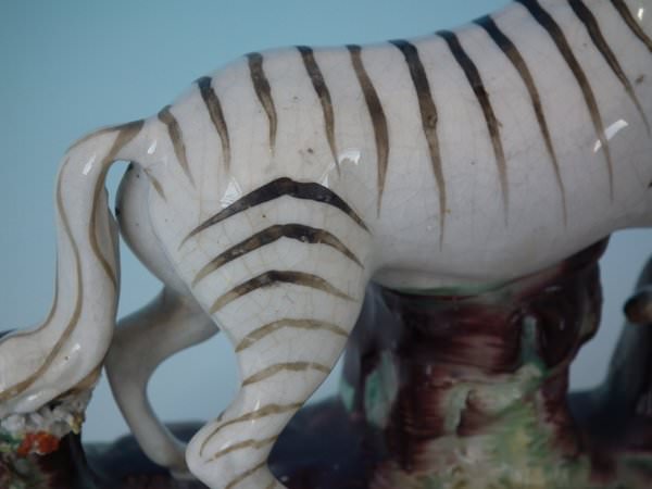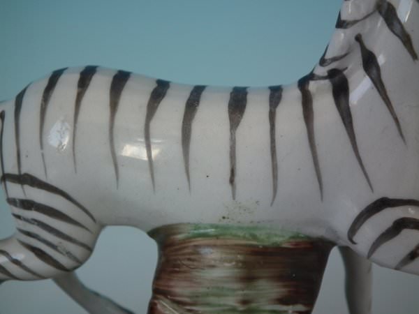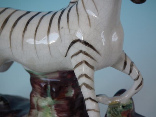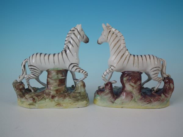 Pair of Staffordshire figures which feature a zebra, stood on a shaped hollow base.
