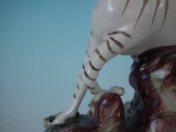 Left facing: Generally good. Two tiny chips to shredded clay by tail.