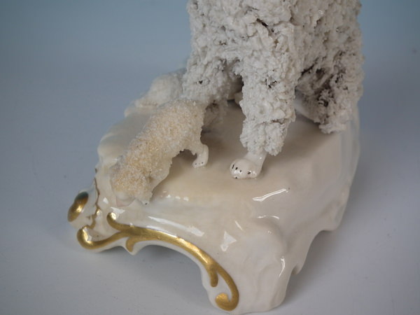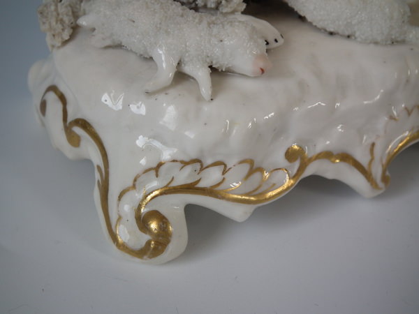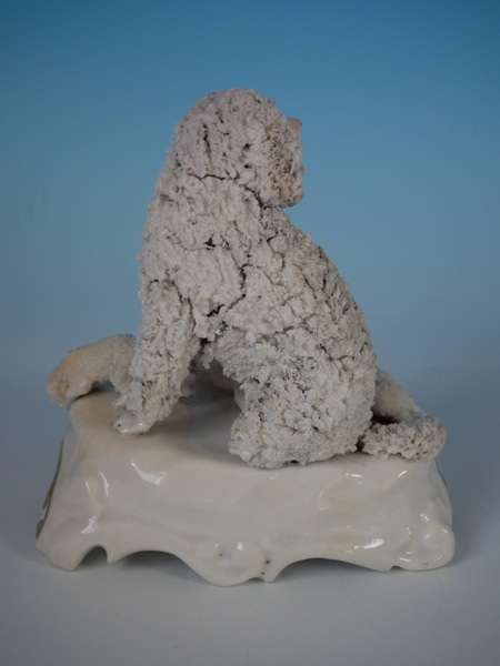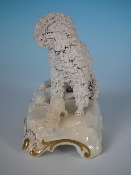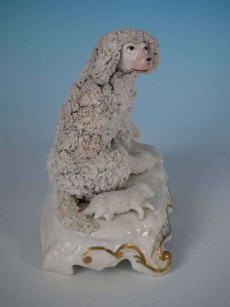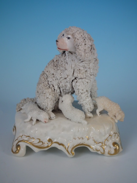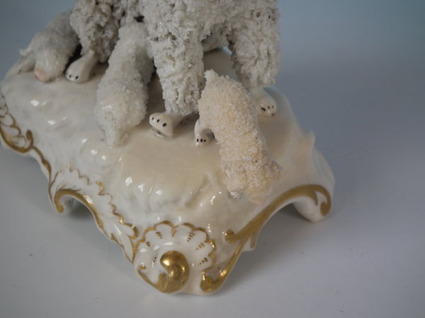 Victorian, circa 1850. 5ins high, 4.7ins wide, 3.4ins depth. Staffordshire group which features a poodle with three pups, seated on a rococo base.