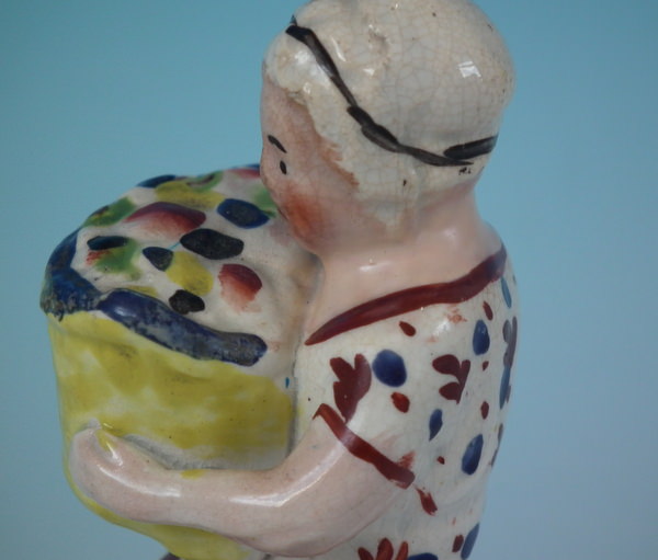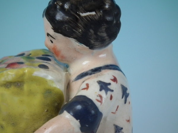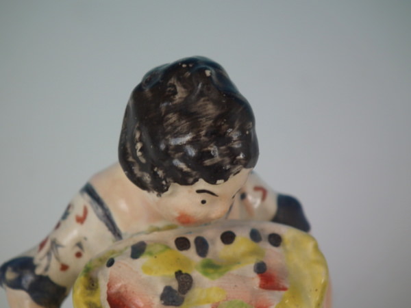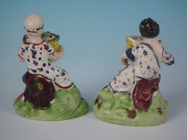 Pair of Staffordshire pearlware figures which feature children with baskets of fruit, seated on a shaped hollow base.