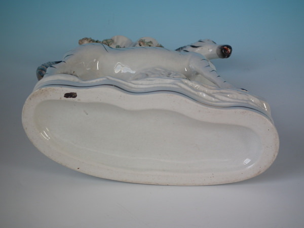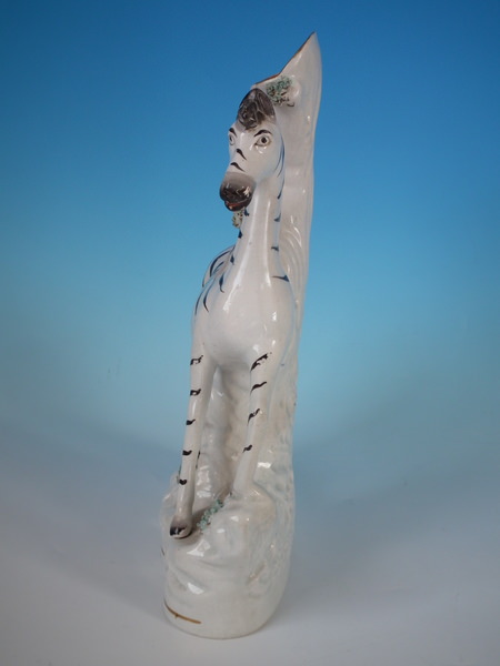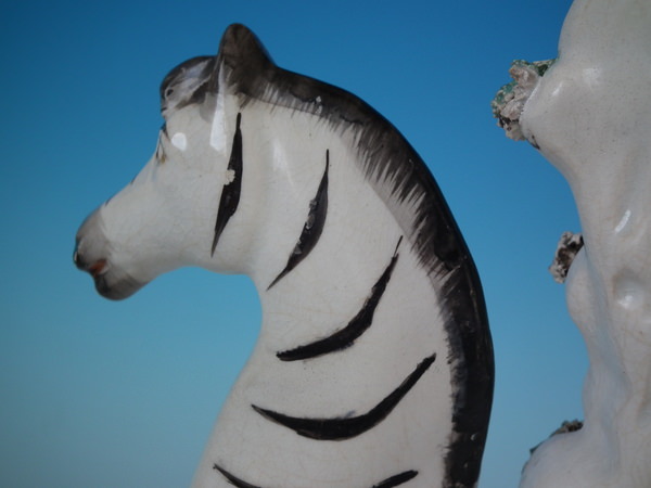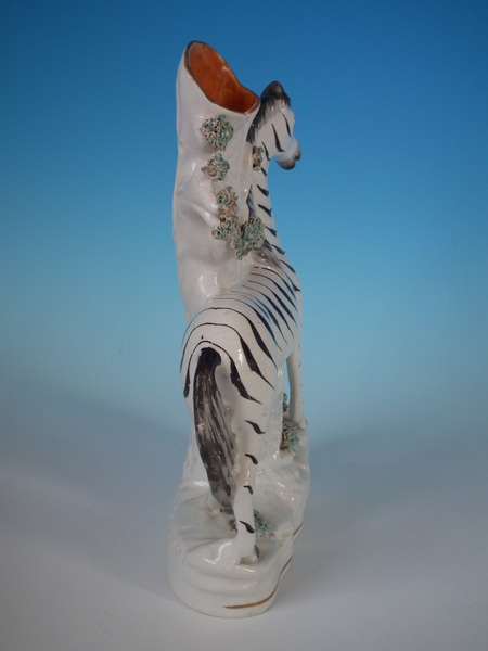 Victorian, circa 1860. 11ins high, 8.7ins wide, 3ins depth. Staffordshire spill vase which features a zebra, stood on a shaped base.