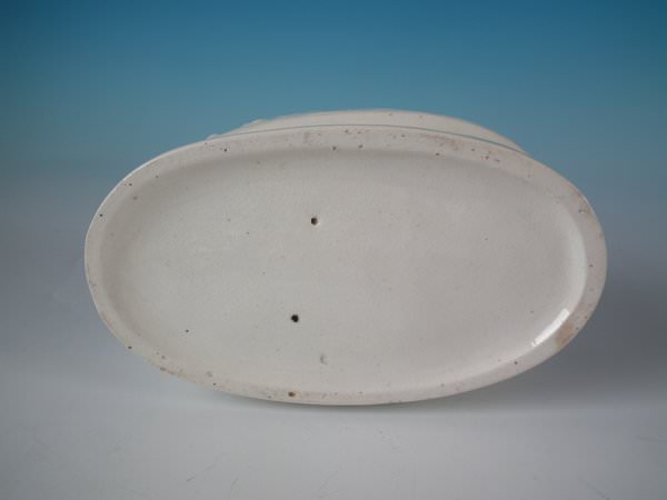 Dull gilt base line and embellishment. Decorated 'in the round' - decoration to front and reverse. Vent hole to the underside.