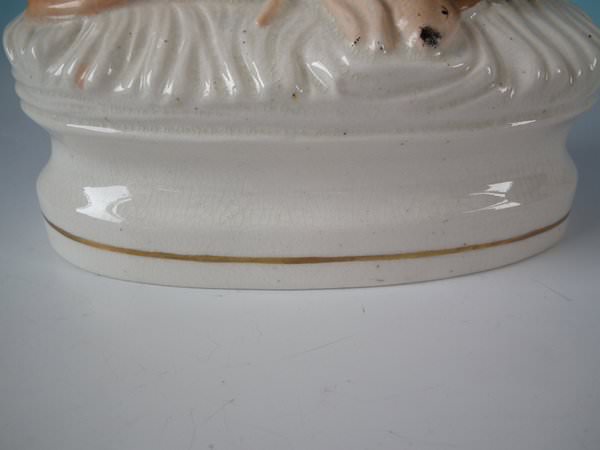 Victorian, circa 1860. 13ins high, 6.9ins wide, 3.9ins depth. Staffordshire figure which features a whippet with a hare lying at it's feet, seated on an oval base.