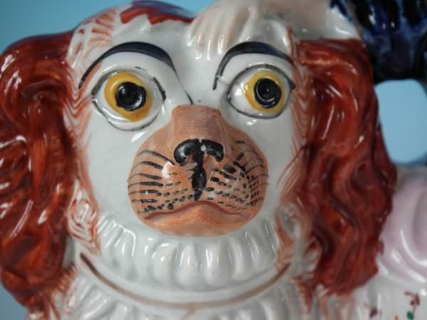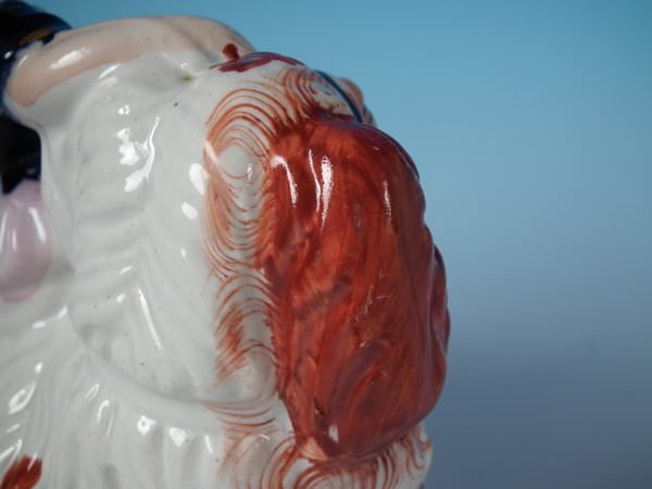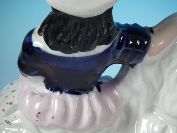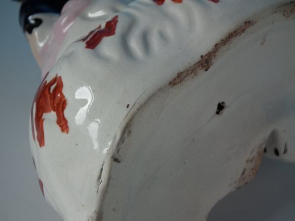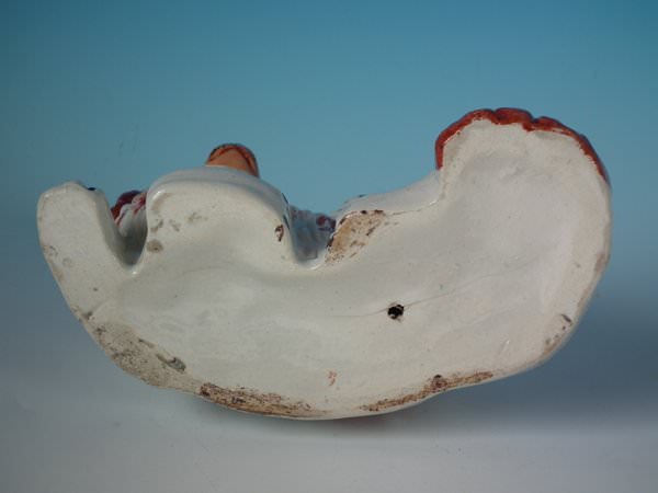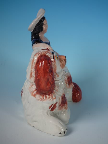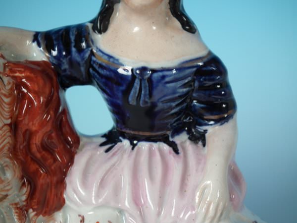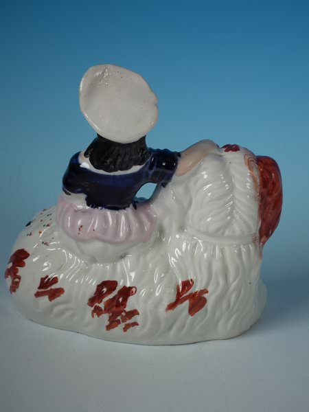 Victorian, circa 1860. 6.7ins high, 6.7ins wide, 3.7ins depth. Staffordshire figure which features a girl seated on a spaniel's back,