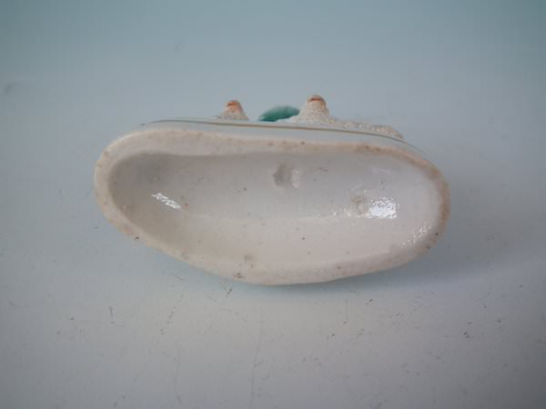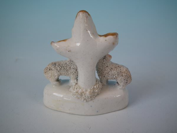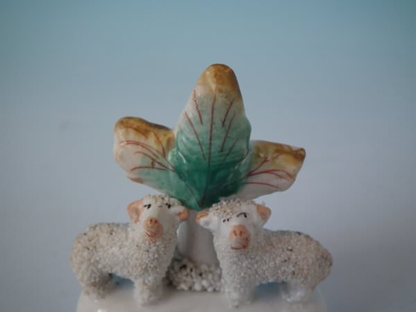 Victorian, circa 1860. 2ins high, 1.9ins wide, 0.9ins depth. Staffordshire group which features two sheep in front of a tree, stood on a shaped base. Ochre painted base line. Decorated mainly to the front.