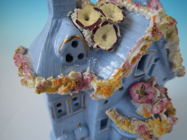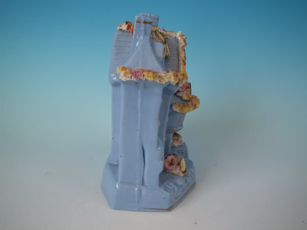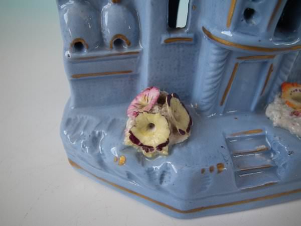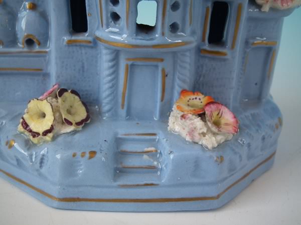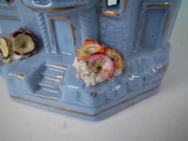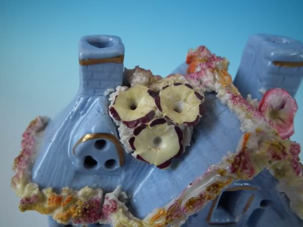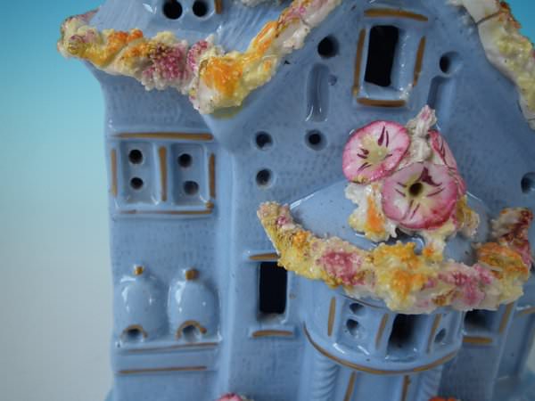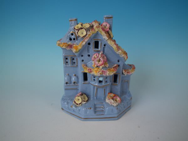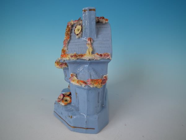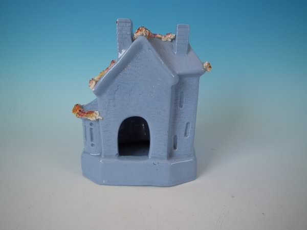 Victorian, circa 1860. 5.8ins high, 4.7ins wide, 3.4ins depth. Dudson Staffordshire pastille burner which features a house with beehives and flowers, stood on a shaped base.
