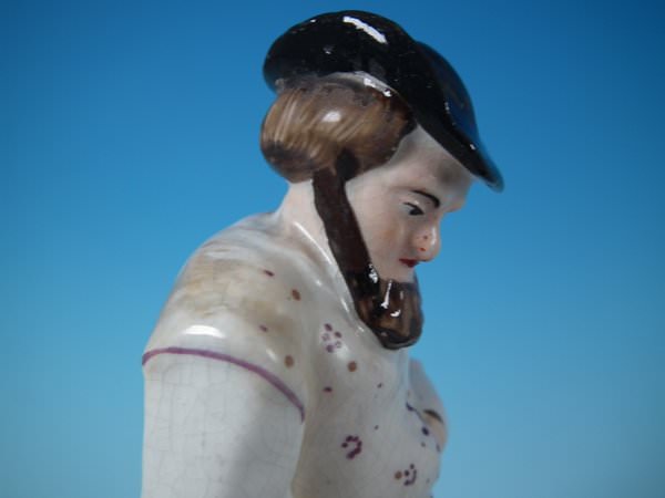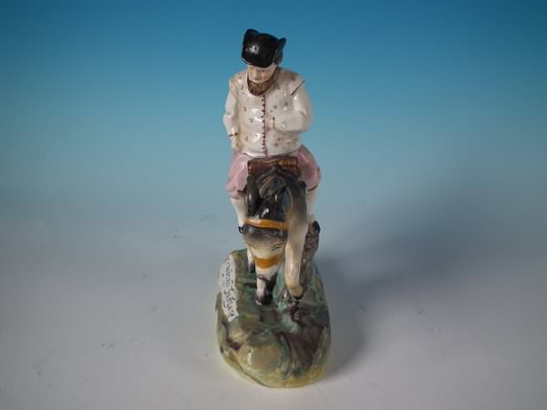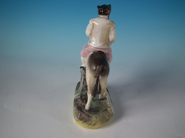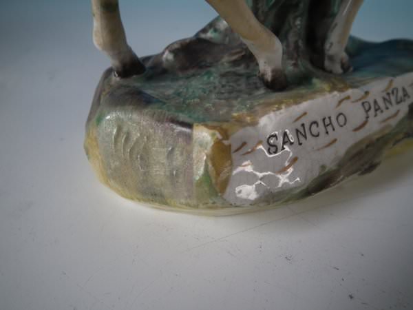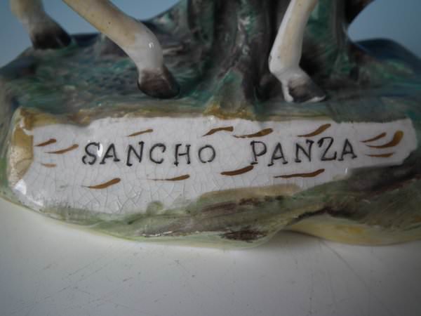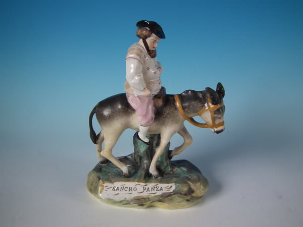 This piece represents the character Sancho Panza from the novel 'Don Quixote'. Sancho acts as squire to Don Quixote. Book reference ,'Victorian Staffordshire Figures 1835-1875' Book 1, by A.& N. Harding, page 274, figure 987.