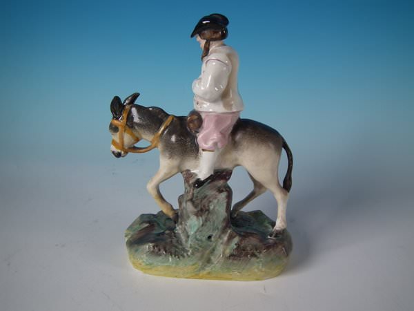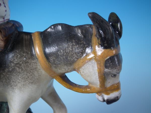 Victorian, circa 1860. 8.1ins high, 6.7ins wide, 3.1ins depth. Parr Factory Staffordshire figure with a theatrical and literary theme which features Sancho Panza seated on an ass, stood on a shaped base.