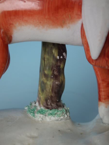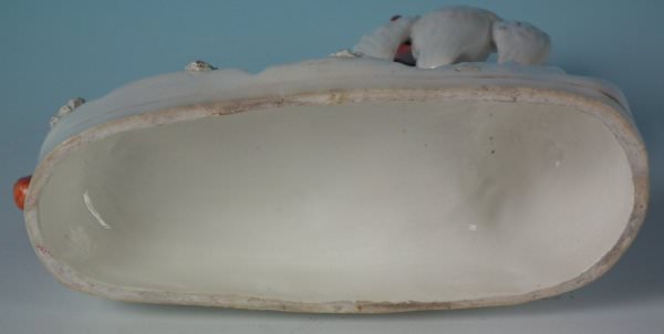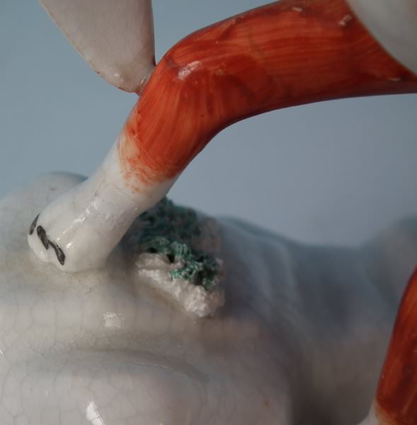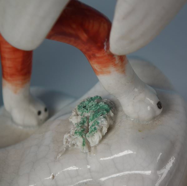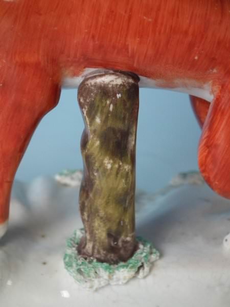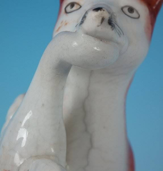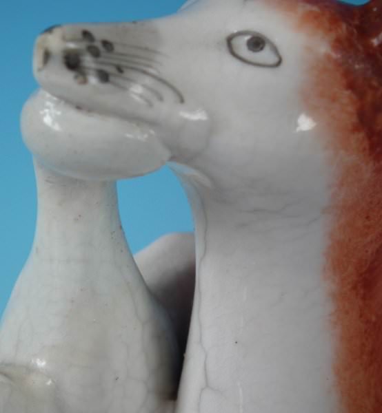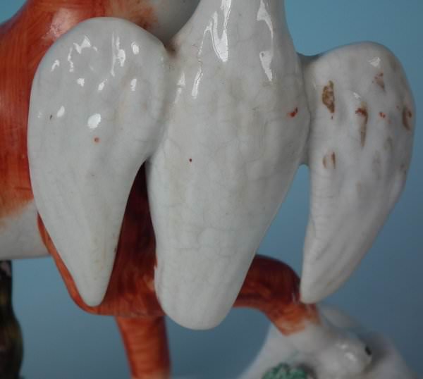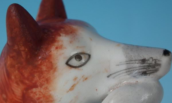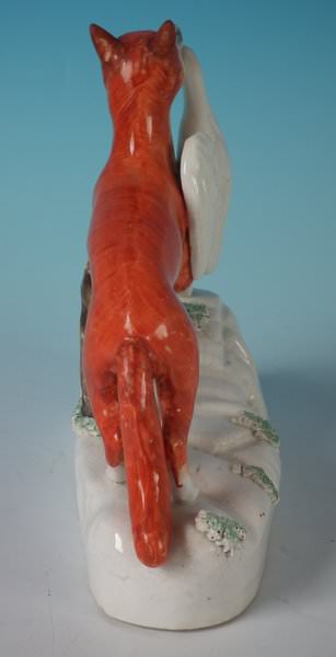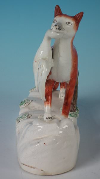Victorian, circa 1860. 6.1ins high, 6.3ins wide, 2.6ins depth. Staffordshire Pottery figure which features a fox with a bird in it's mouth, stood on an oblong base. Dull gilt base line and embellishment.
