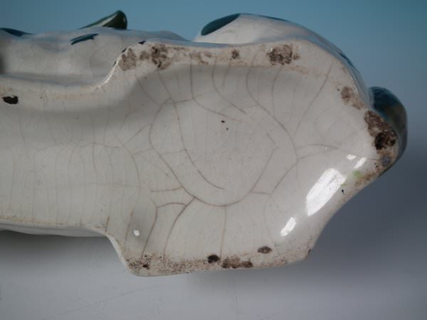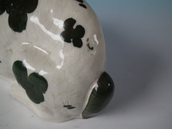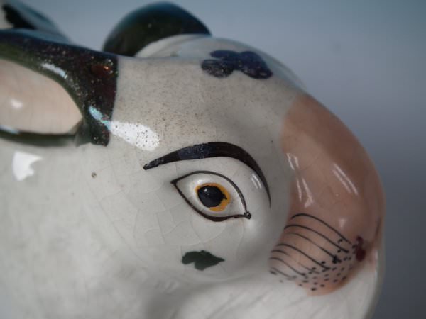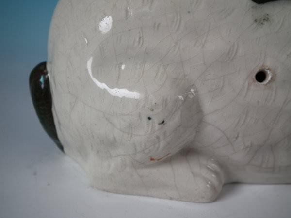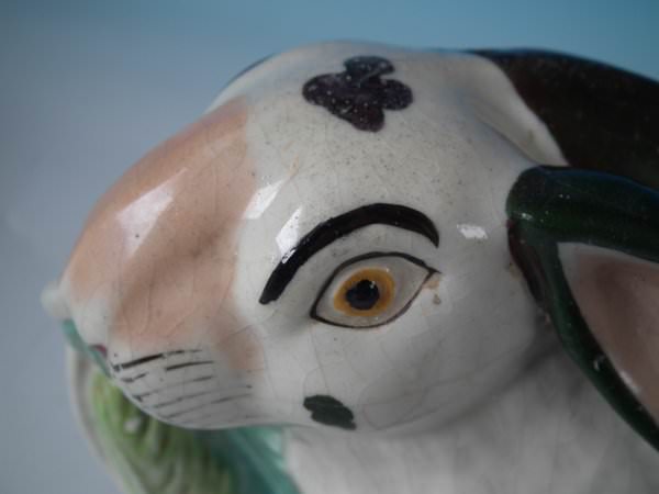 Victorian, circa 1860. 5.1ins high, 9.4ins wide, 3.7ins depth. Staffordshire figure which features a rabbit, seated directly on the ground, no base.