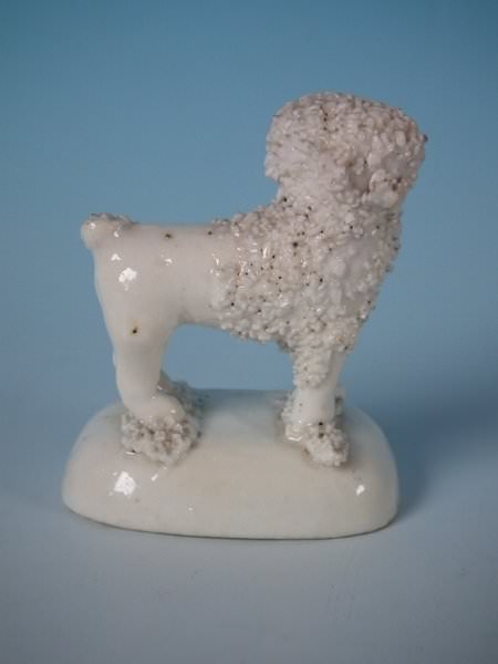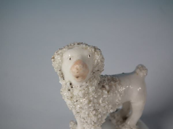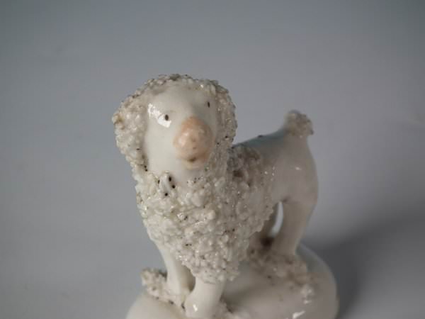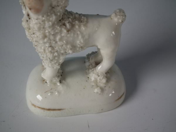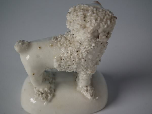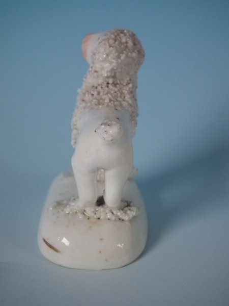 Victorian, circa 1840. 2.4ins high, 2ins wide, 1.4ins depth. Staffordshire porcellaneous figure which features a poodle, stood on a rectangular base.