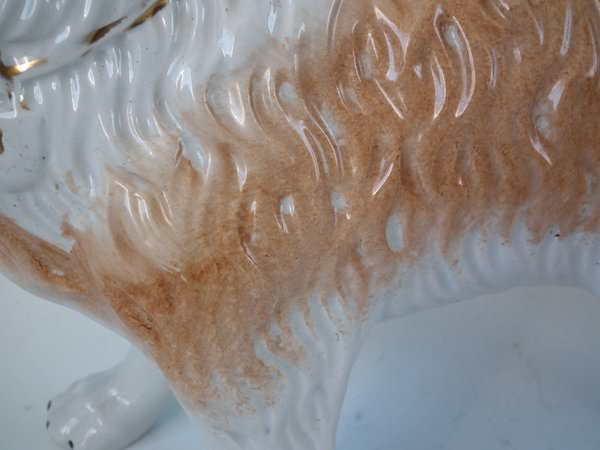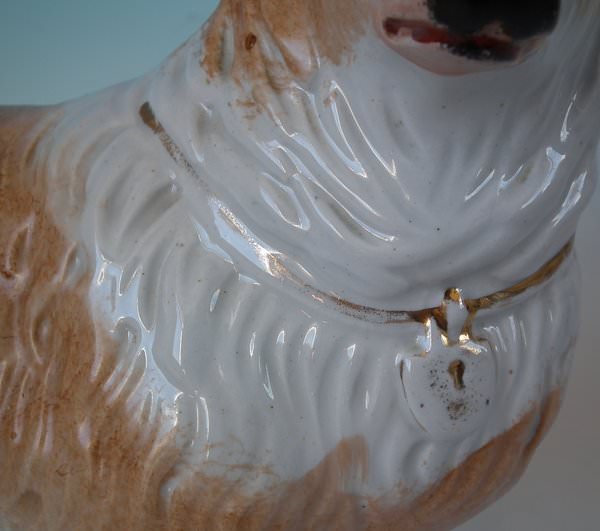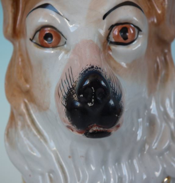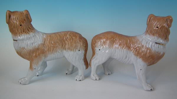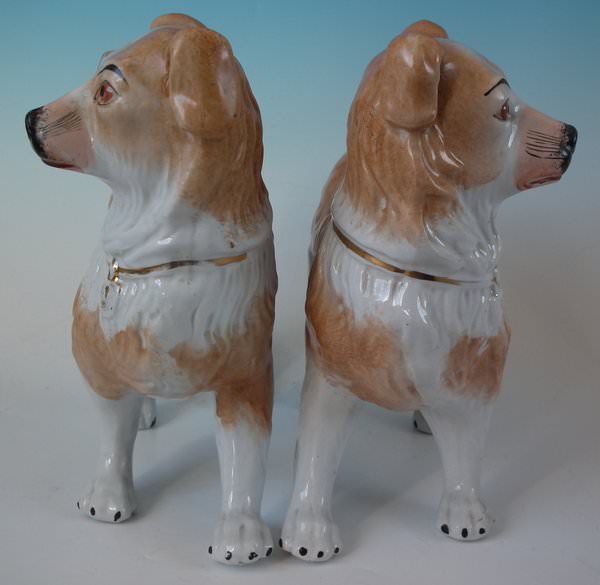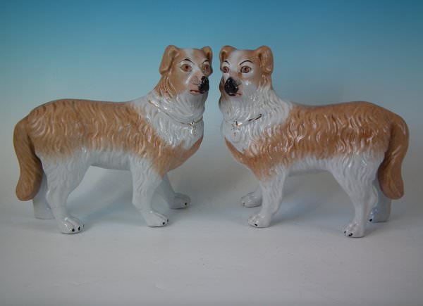 Victorian, circa 1890. Tallest is 10.8ins high, 11.4ins wide, 4.1ins depth. Pair of Staffordshire Pottery figures which feature Collie dogs, stood directly on the ground, no base. Tan and white version. Bright gilt embellishment.
