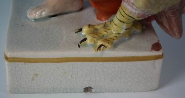 pre-Victorian, circa 1820. Tallest is 6.4ins high, 3.3ins wide, 2.4ins depth. Pair of Staffordshire Pottery pearlware figures with a mythological theme which feature Jupiter with the eagle and Juno with a peacock, stood on a square base.