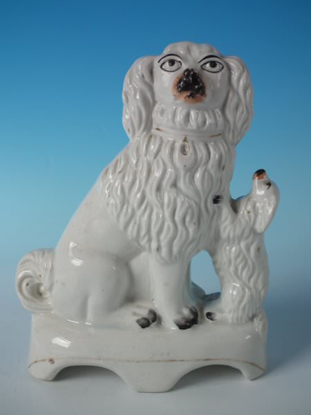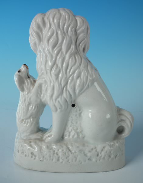 Staffordshire Pottery group which features a spaniel and begging pup, seated on a plinth base.