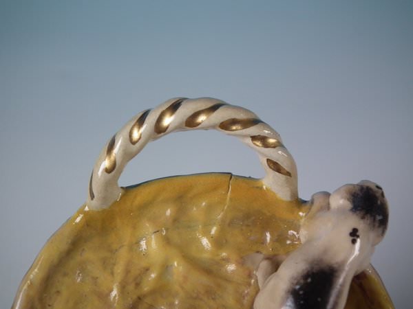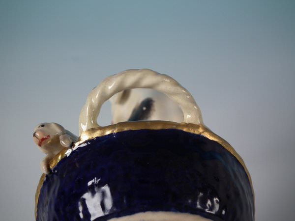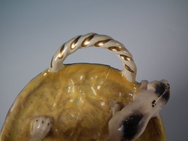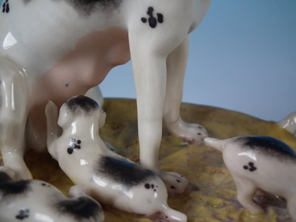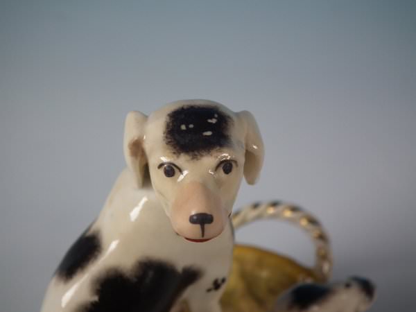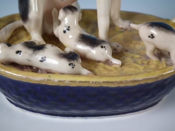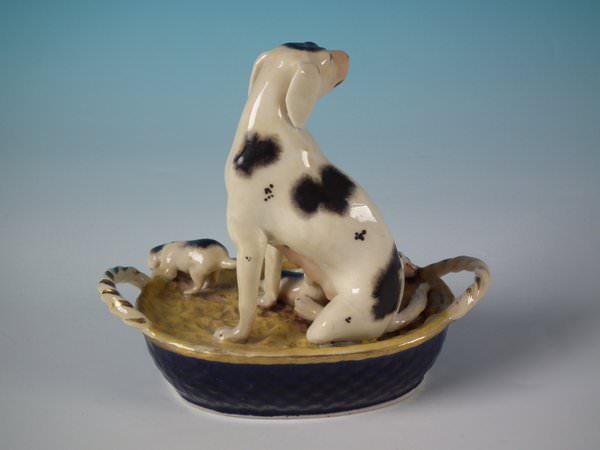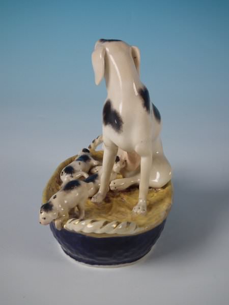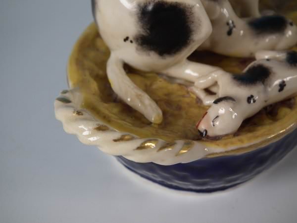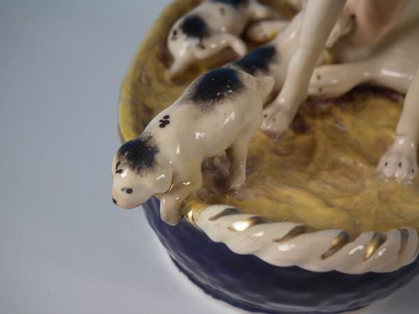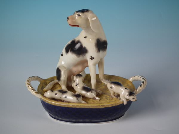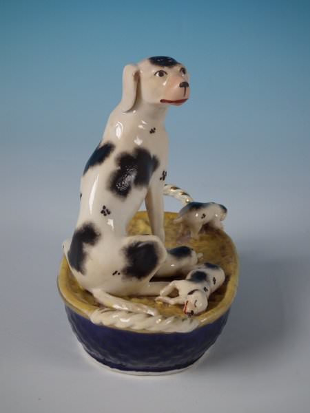Victorian, circa 1860. 4.9ins high, 5.3ins wide, 3ins depth. Staffordshire Pottery figure which features a dog with her pups in a basket,