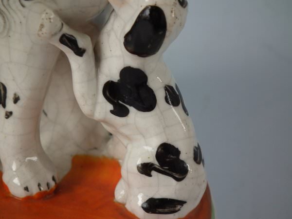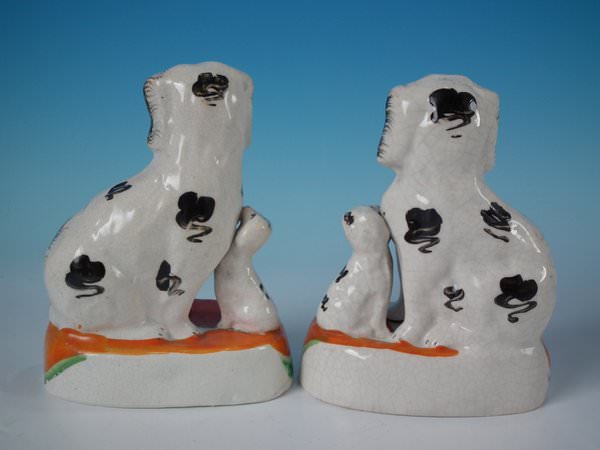 Pair of Staffordshire Pottery groups which feature a spaniel and begging pup, seated on a tasselled cushion base.