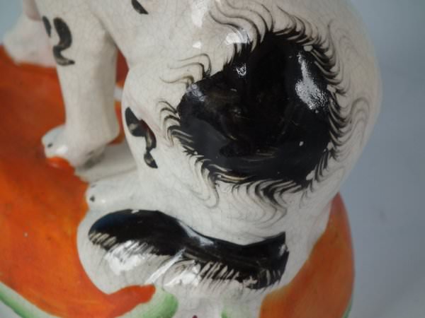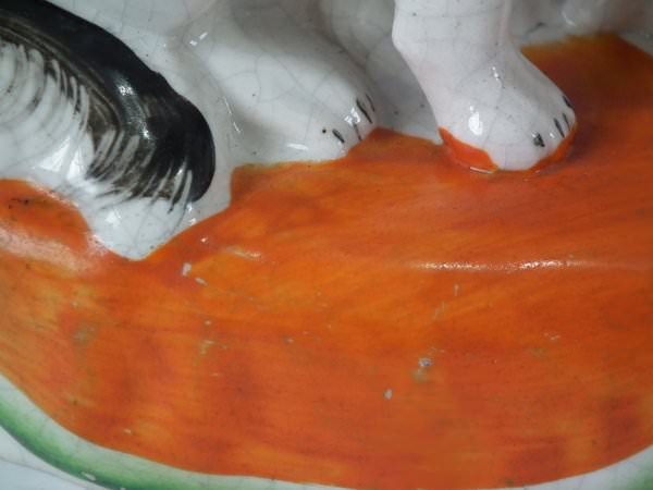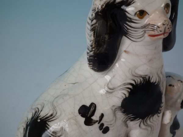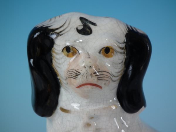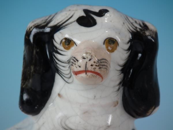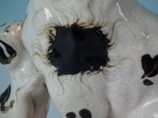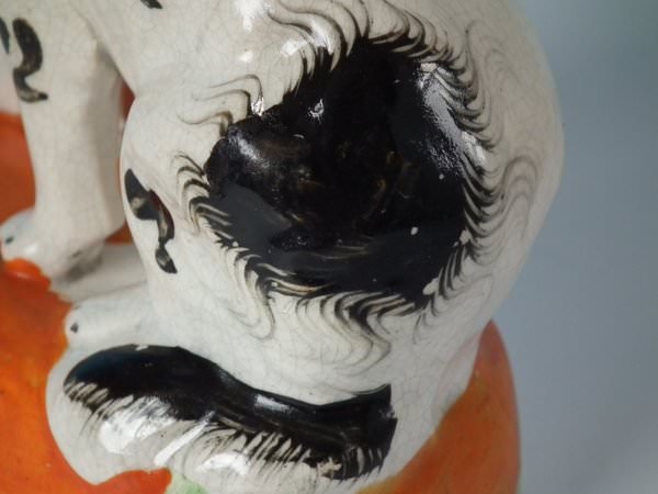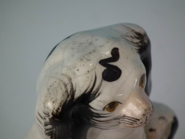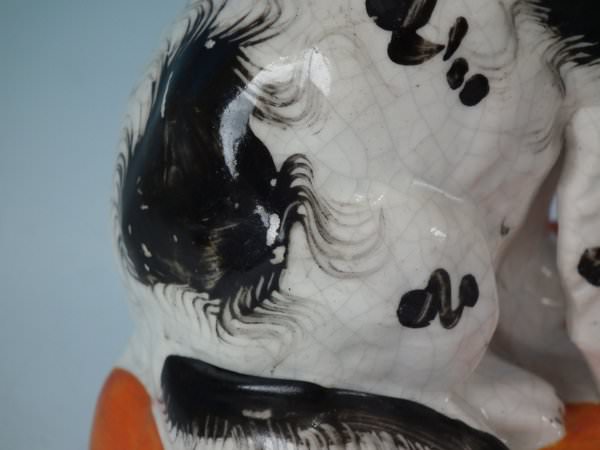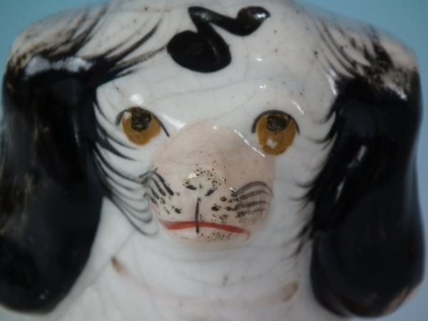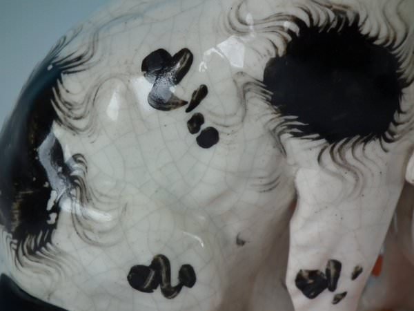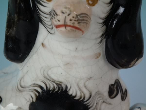 KILN EFFECTS: kiln soot caught in the glaze to the top of spaniel's head;