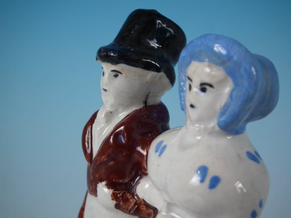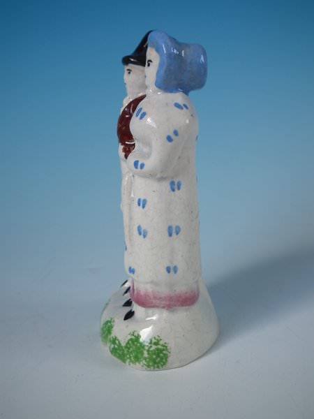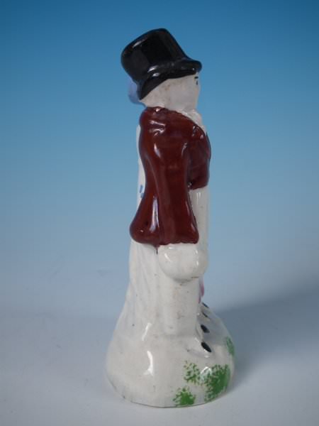 pre-Victorian, circa 1820. 4.7ins high, 2.6ins wide, 2ins depth. Scottish Staffordshire Pottery Prattware figure which features 'The Dandies', stood on a shaped base.