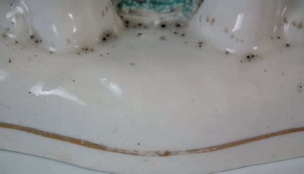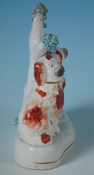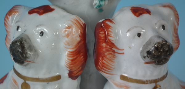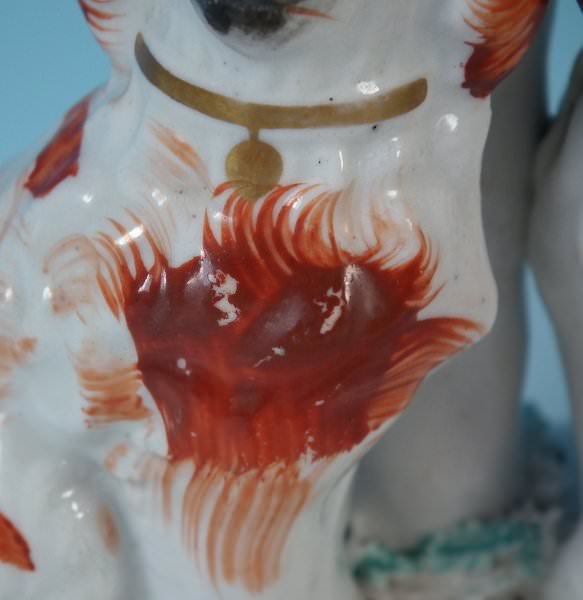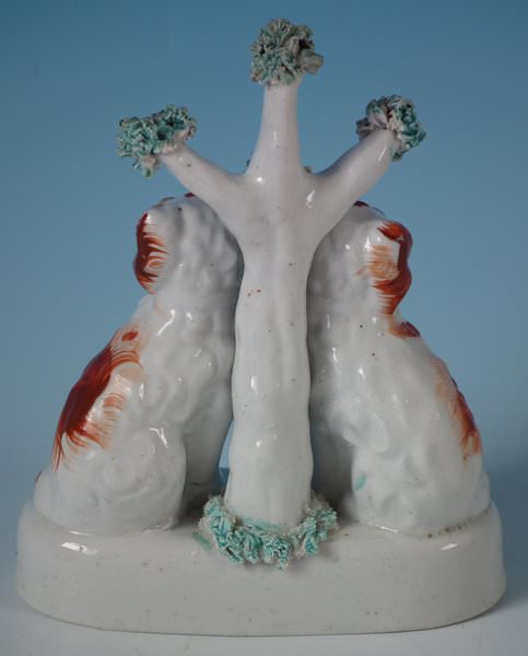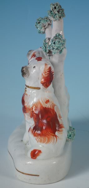 Victorian, circa 1860. 5.2ins high, 4.4ins wide, 2.2ins depth. Staffordshire group which features two russet and white spaniels under a tree, seated on a shaped base. Dull gilt base line and embellishment.