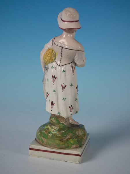 Wood family Staffordshire Pottery pearlware figure with a pastoral theme which features a lady carrying a wheat bundle and scythe, stood on a square base.