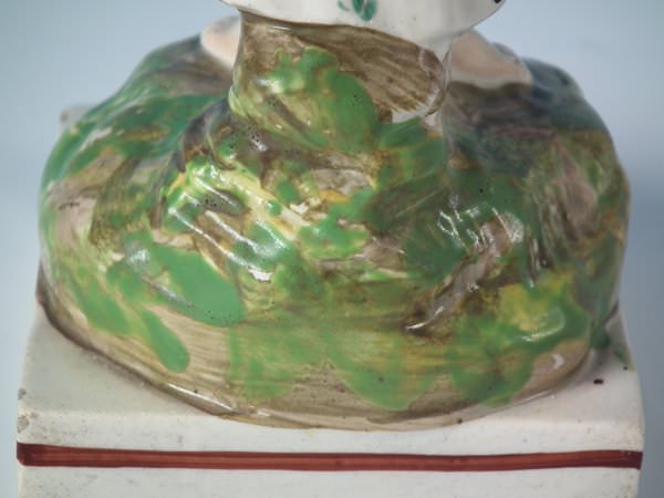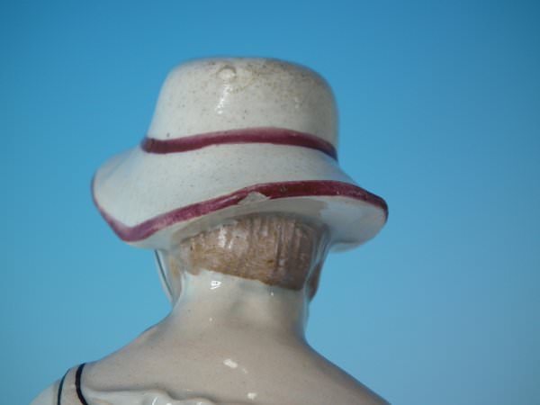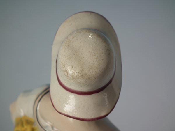 KILN EFFECTS: kiln soot caught in the glaze to the top of her hat;