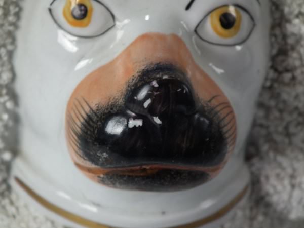 Left facing: Very good. No restoration. Minor paint losses to muzzle, nose and paws.
