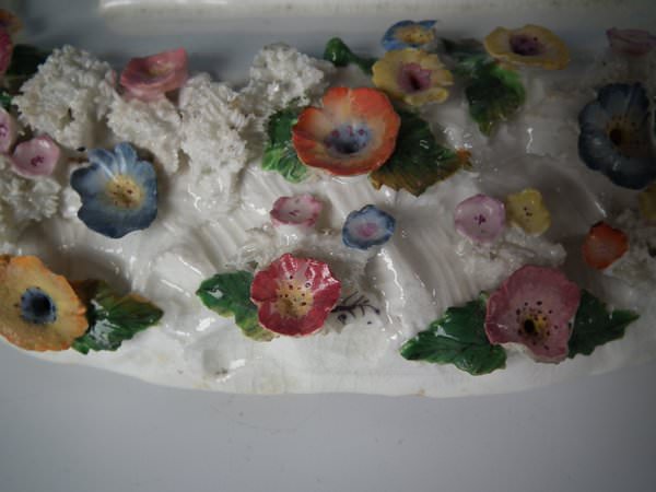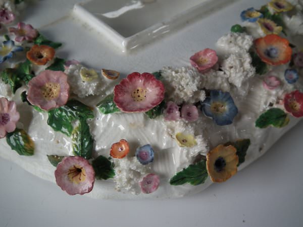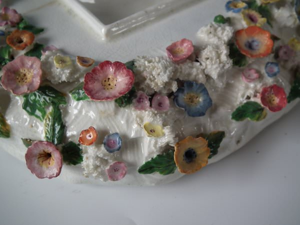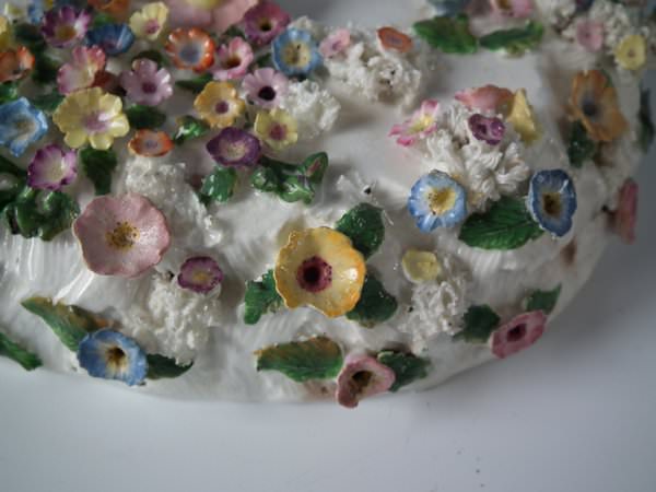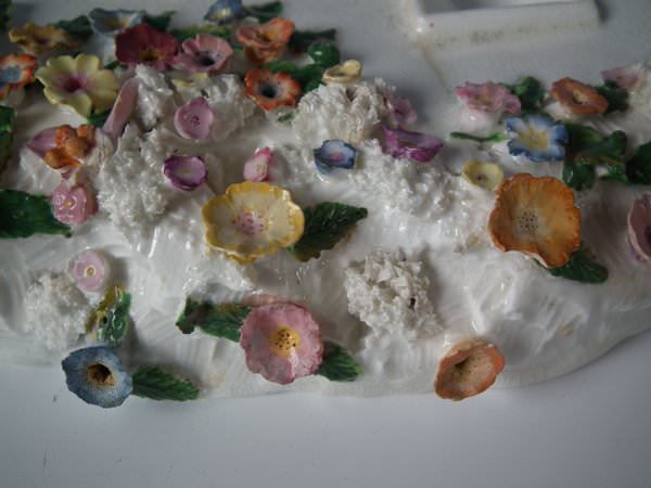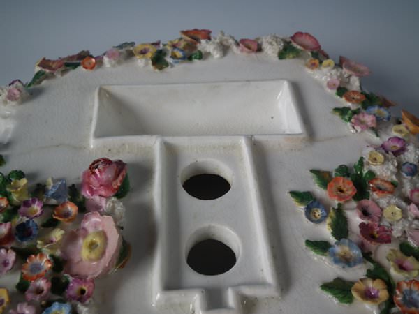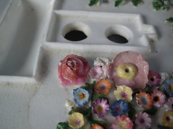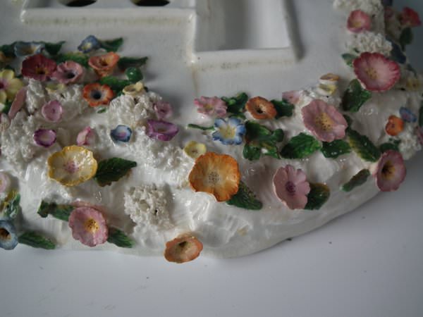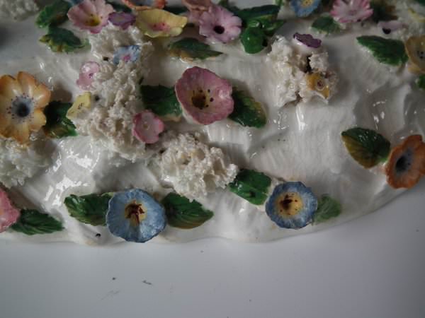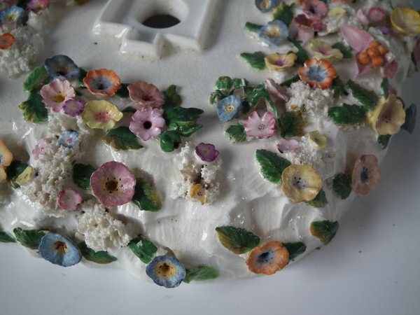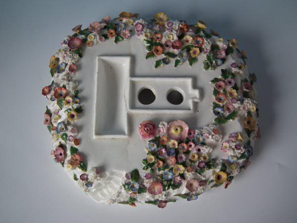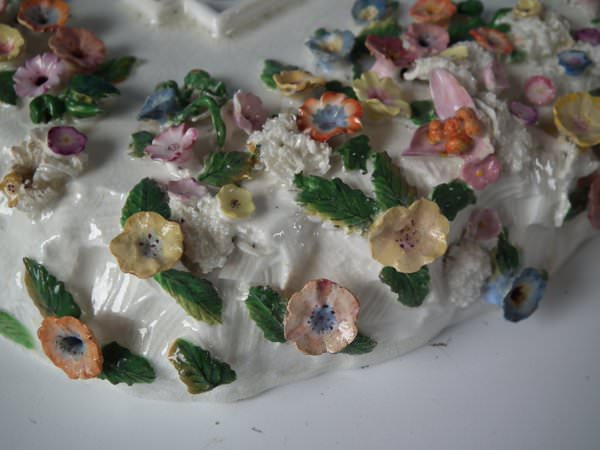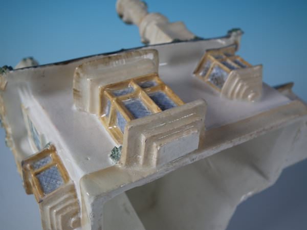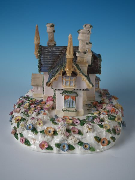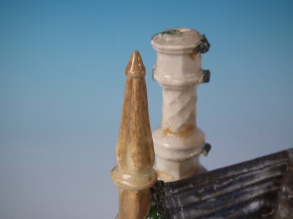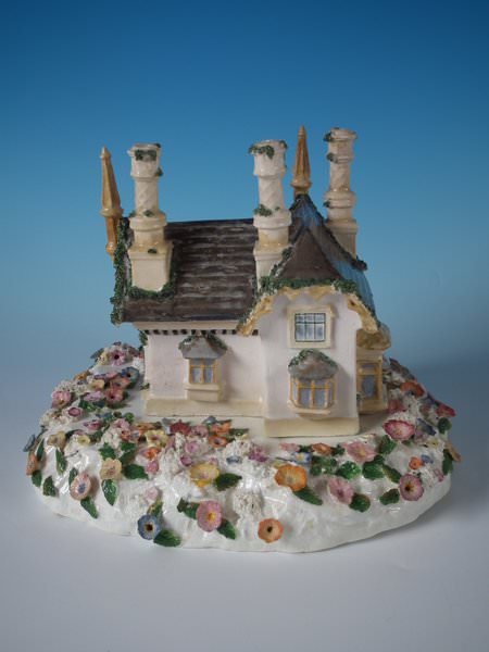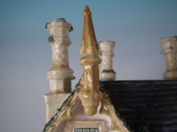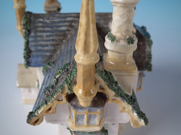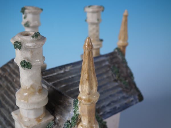 with decorative chimneys and gable spires, sat on a shaped flower encrusted base.