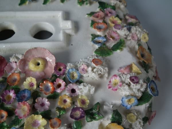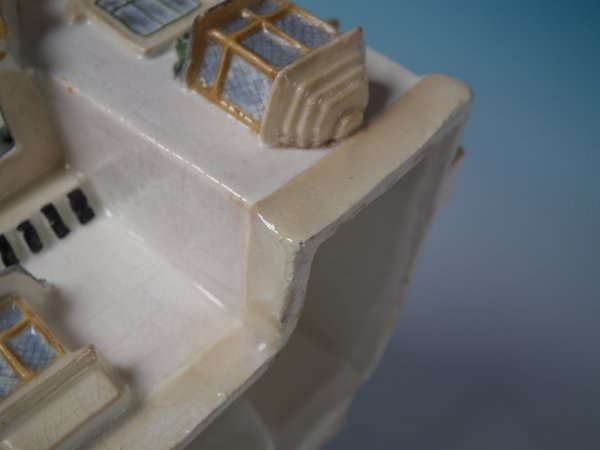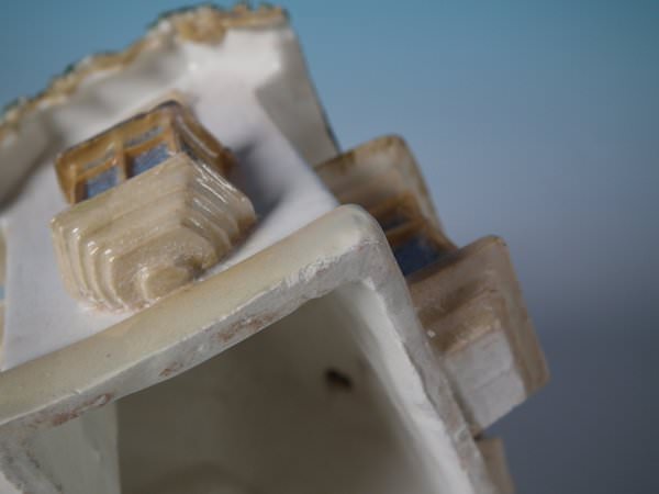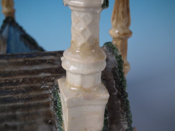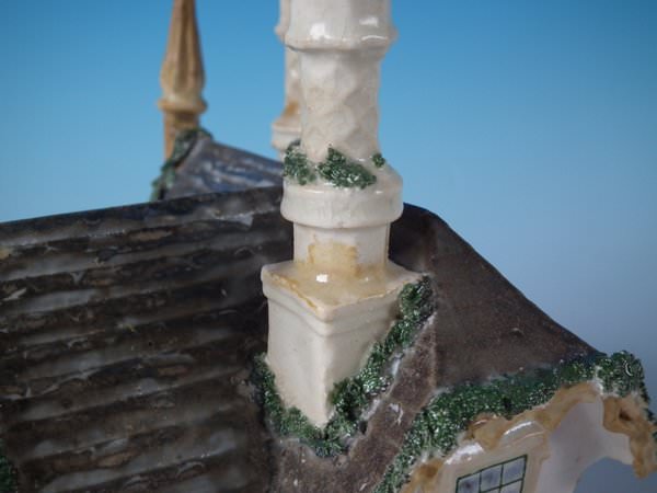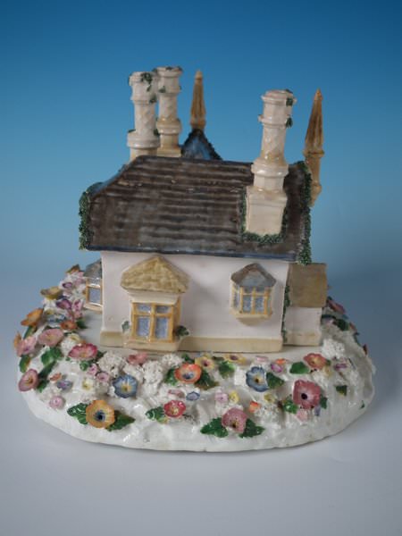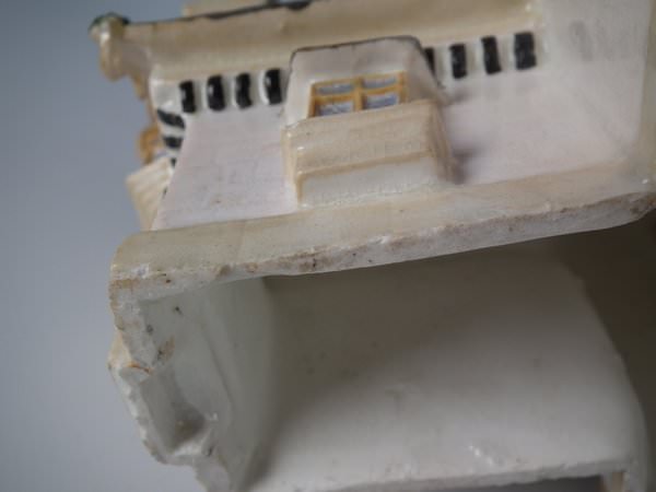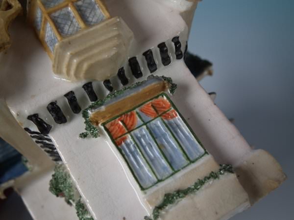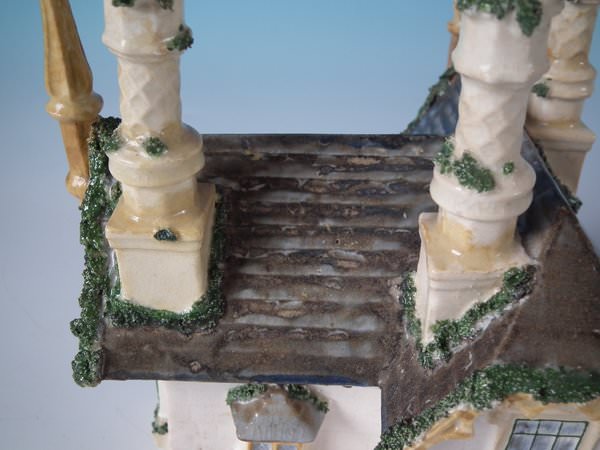 Victorian, circa 1850. 7.1ins high, 9.1ins wide, 9.1ins depth. Staffordshire Pottery pastille burner which features a country house