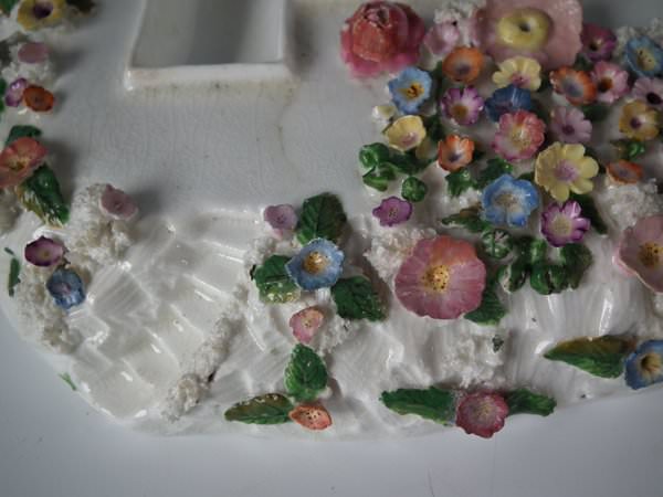 Chimneys and spires reglued and joins retouched. Old restoration has discoloured in places.