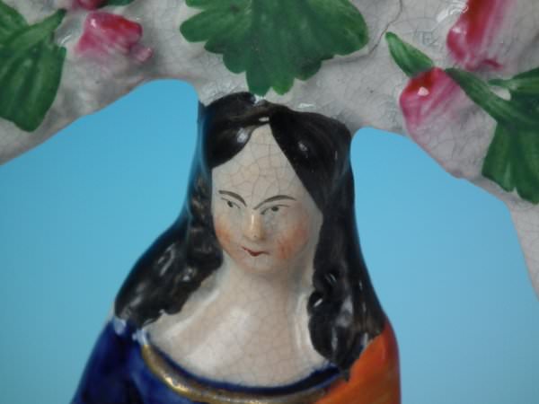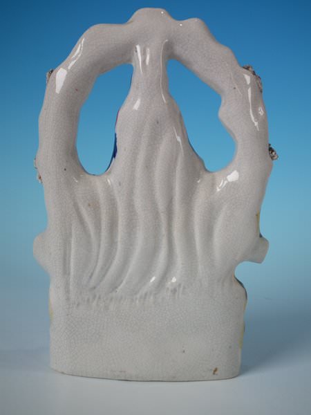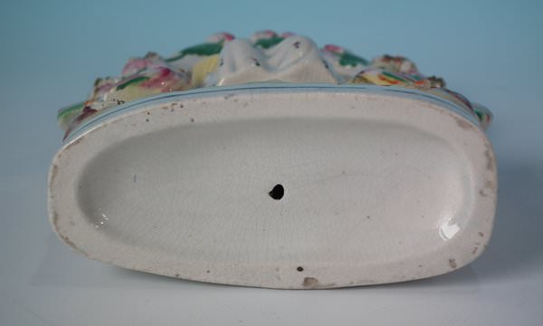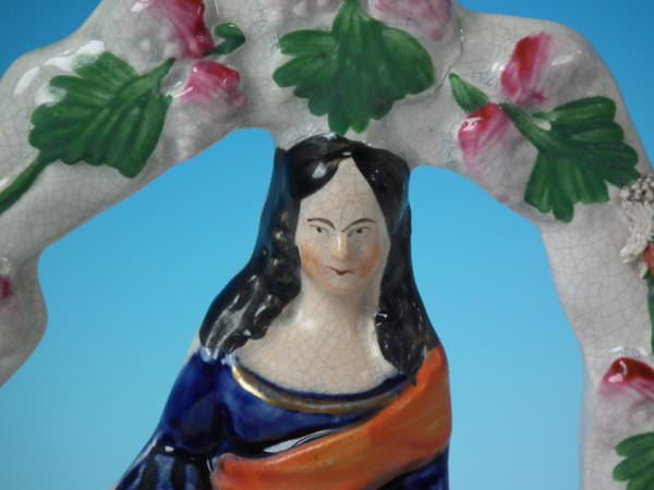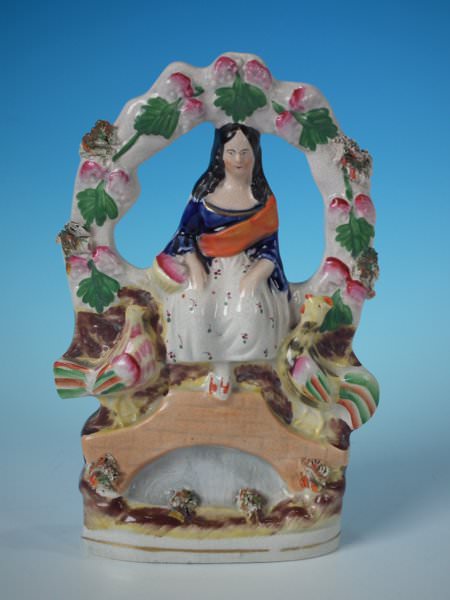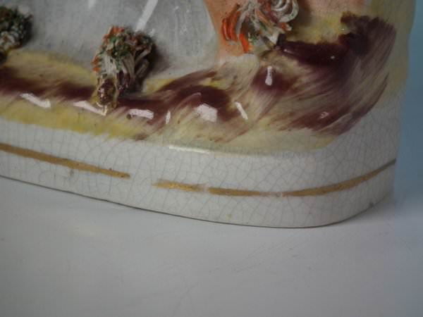 Staffordshire figure with a pastoral theme which features a girl on a bridge with a hen and cockerel/rooster on either side of her, seated on an oblong base.