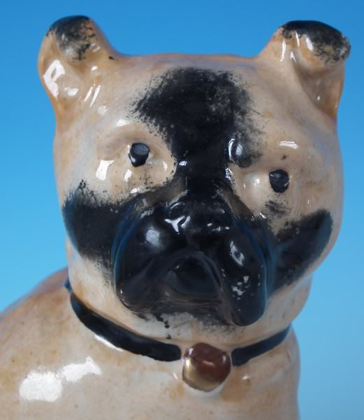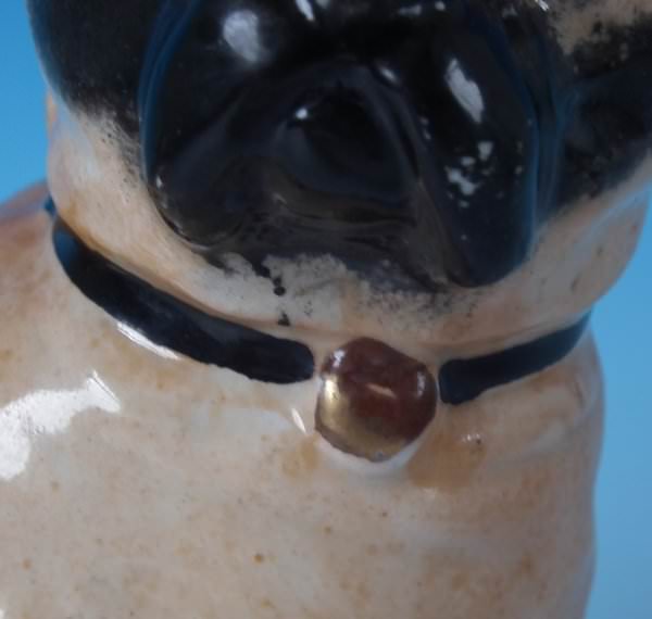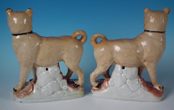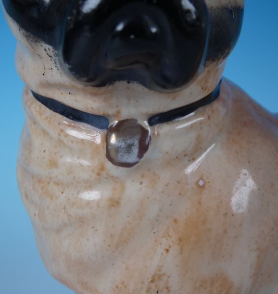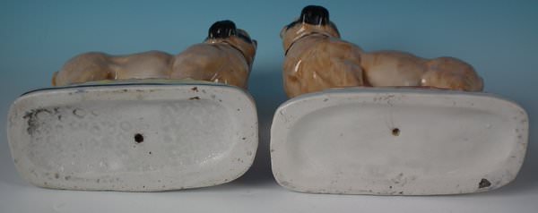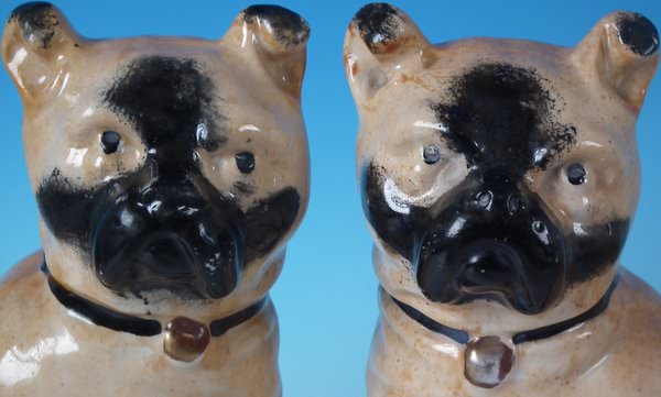 Victorian, circa 1880. Tallest is 8.7ins high, 7.2ins wide, 3.2ins depth. Pair of Staffordshire Pottery figures which feature a pug, stood on a rectangular base. Bright gilt base line.