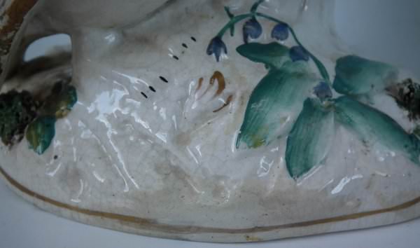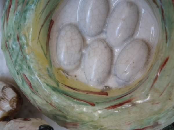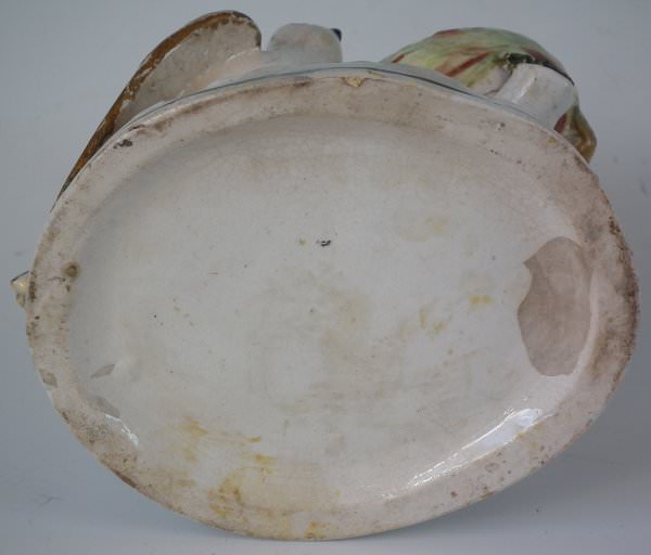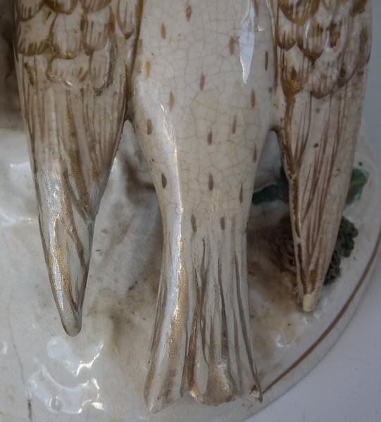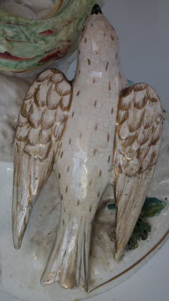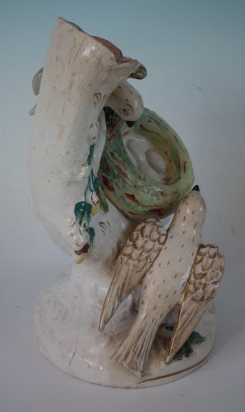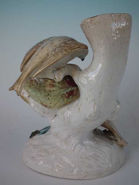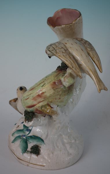 Victorian, circa 1860. 8.5ins high, 6.1ins wide, 4.9ins depth. Staffordshire Pottery spill vase which features two birds sat either side of their egg-filled nest, perched on an oval base. Dull gilt base line and embellishment.