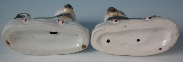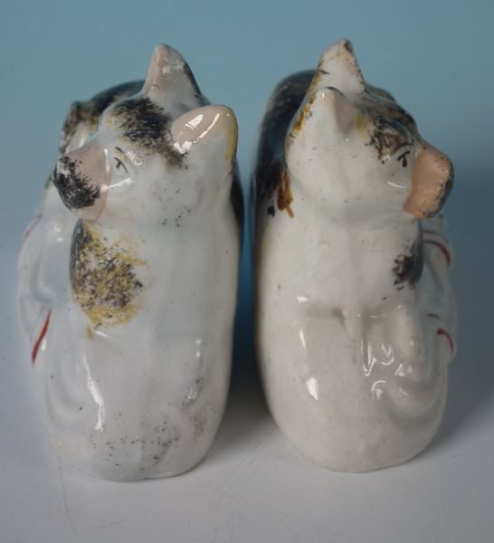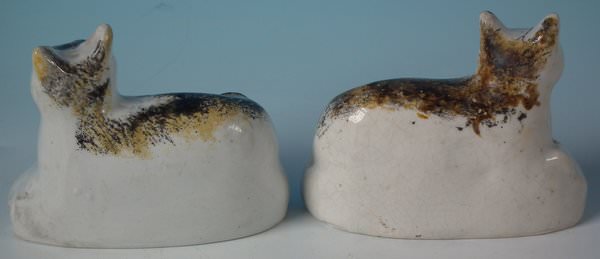 Victorian, circa 1860. Tallest is 3ins high, 3.7ins wide, 1.6ins depth. Pair of Staffordshire Pottery figures which feature a cat, recumbent on a cushion base.